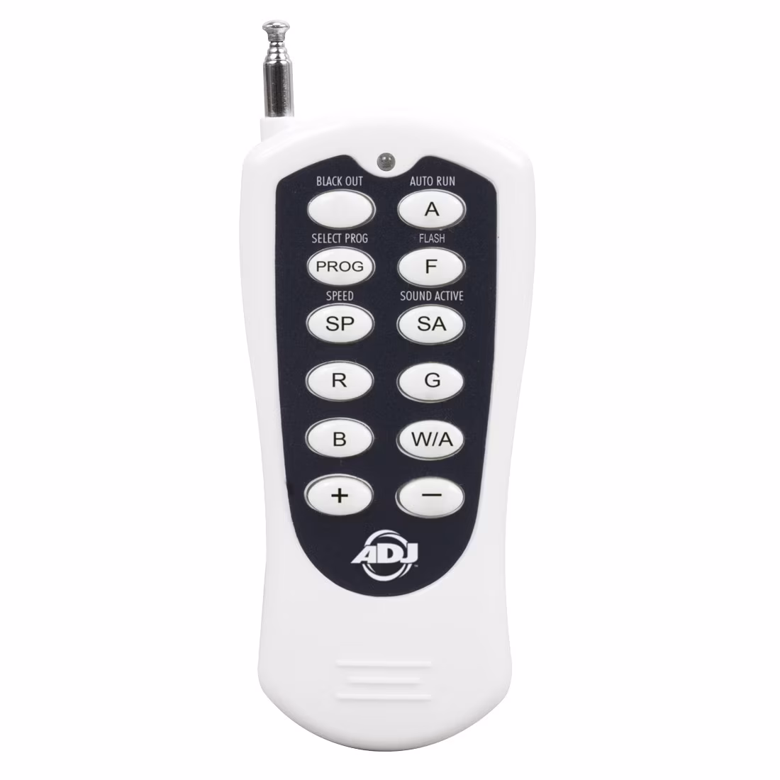 La télécommande ADJ RCF RF fonctionne sur le principe de la radiofréquence. Grâce à elle, vous pourrez lancer des programmes prédéfinis, activer le son ou le mode automatique, régler la vitesse du programme, passer d'une couleur à l'autre ou allumer le stroboscope. Les boutons plus et moins permettent de régler l'intensité lumineuse, la vitesse de l'effet stroboscopique et de sélectionner les programmes. Le contrôleur est compatible avec les modèles suivants :