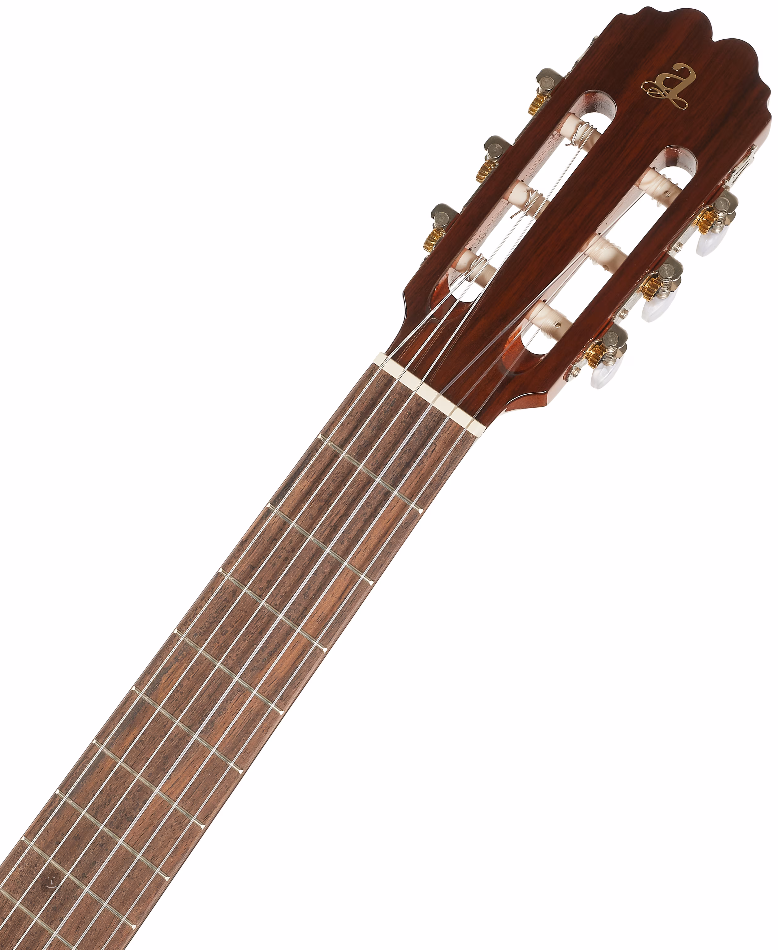 L'Admira Málaga (ADM054078) est un instrument abordable de taille 7/8 qui convient aux guitaristes débutants et aux étudiants des écoles de musique. Elle se caractérise par une construction semi-solide avec une table d'harmonie en cèdre massif et un dos et des éclisses en sapelli stratifié. Le corps est recouvert d'une laque brillante. Une touche en bois de kabukalli est collée au manche en acajou africain. Les cordes sont montées sur des mécaniques classiques en nickel et une touche en kabukalli. La finition élégante est accentuée par des éléments traditionnels tels que des rosettes, des passepoils et le logo de l'entreprise sur la tête.