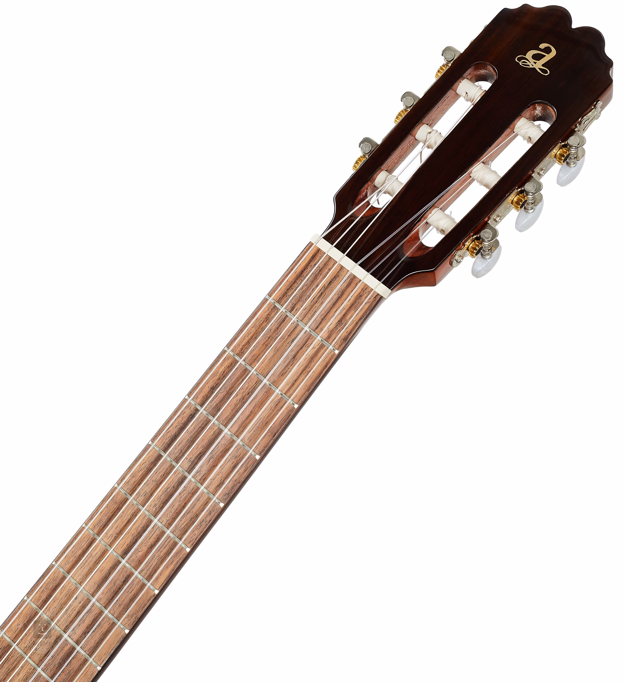La guitare classique Admira Málaga (ADM0540) est un instrument abordable qui convient aux guitaristes débutants et aux étudiants des écoles de musique. Elle se caractérise par une construction semi-solide avec une table en cèdre massif et un dos et des éclisses en sapelli stratifié. Le corps est recouvert d'une laque brillante. Une touche en bois de kabukalli est collée au manche en acajou africain. Les cordes sont montées sur des mécaniques classiques en nickel et une touche en kabukalli. La finition élégante est accentuée par des éléments traditionnels tels que des rosettes, des passepoils et le logo de l'entreprise sur la tête.