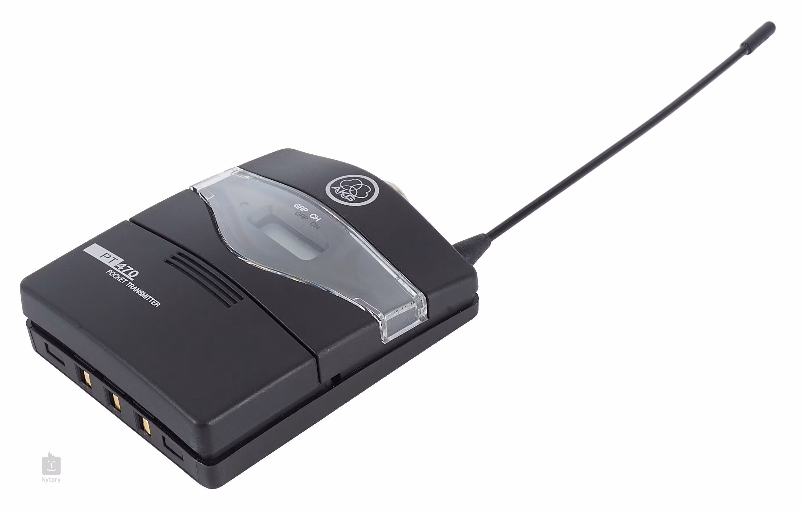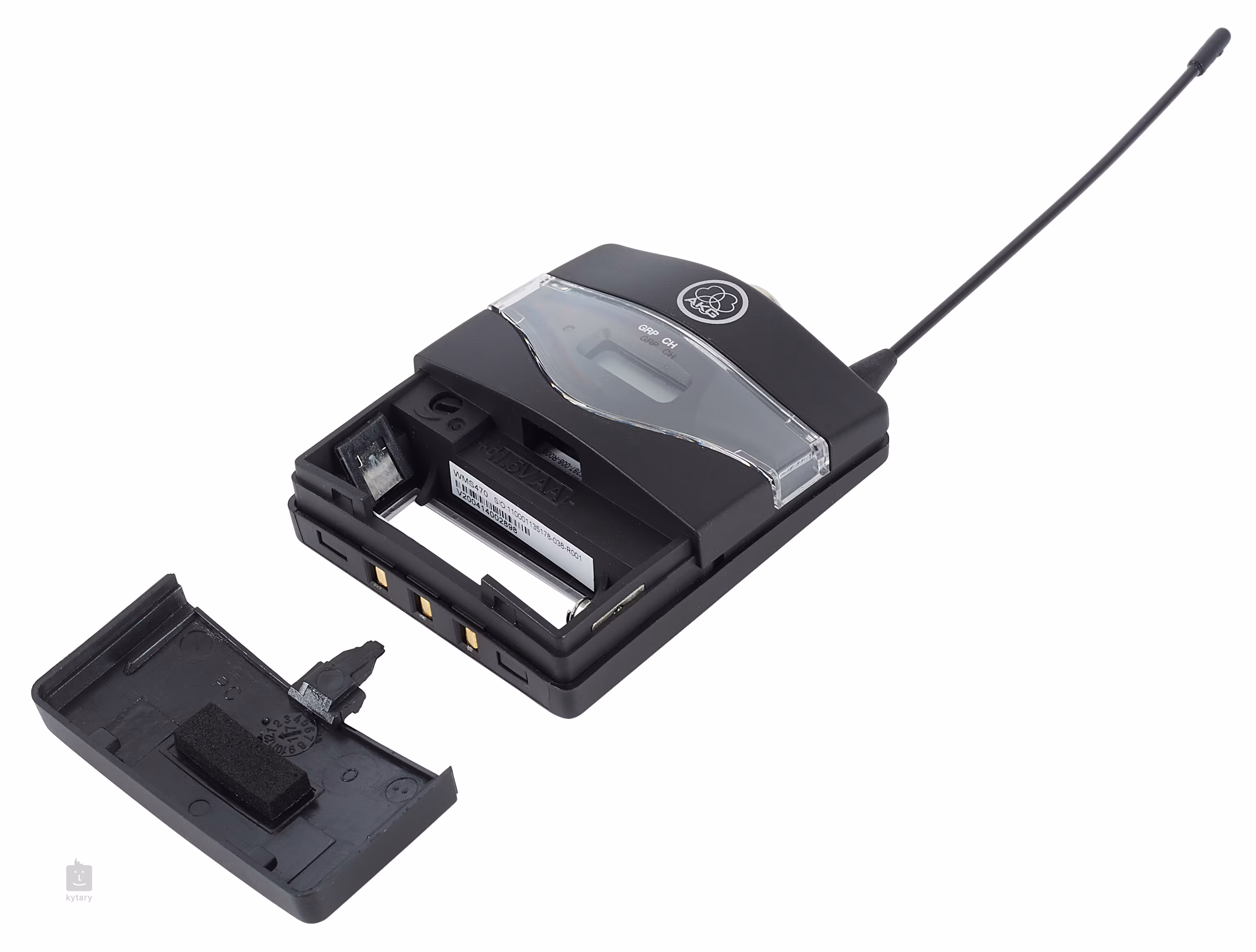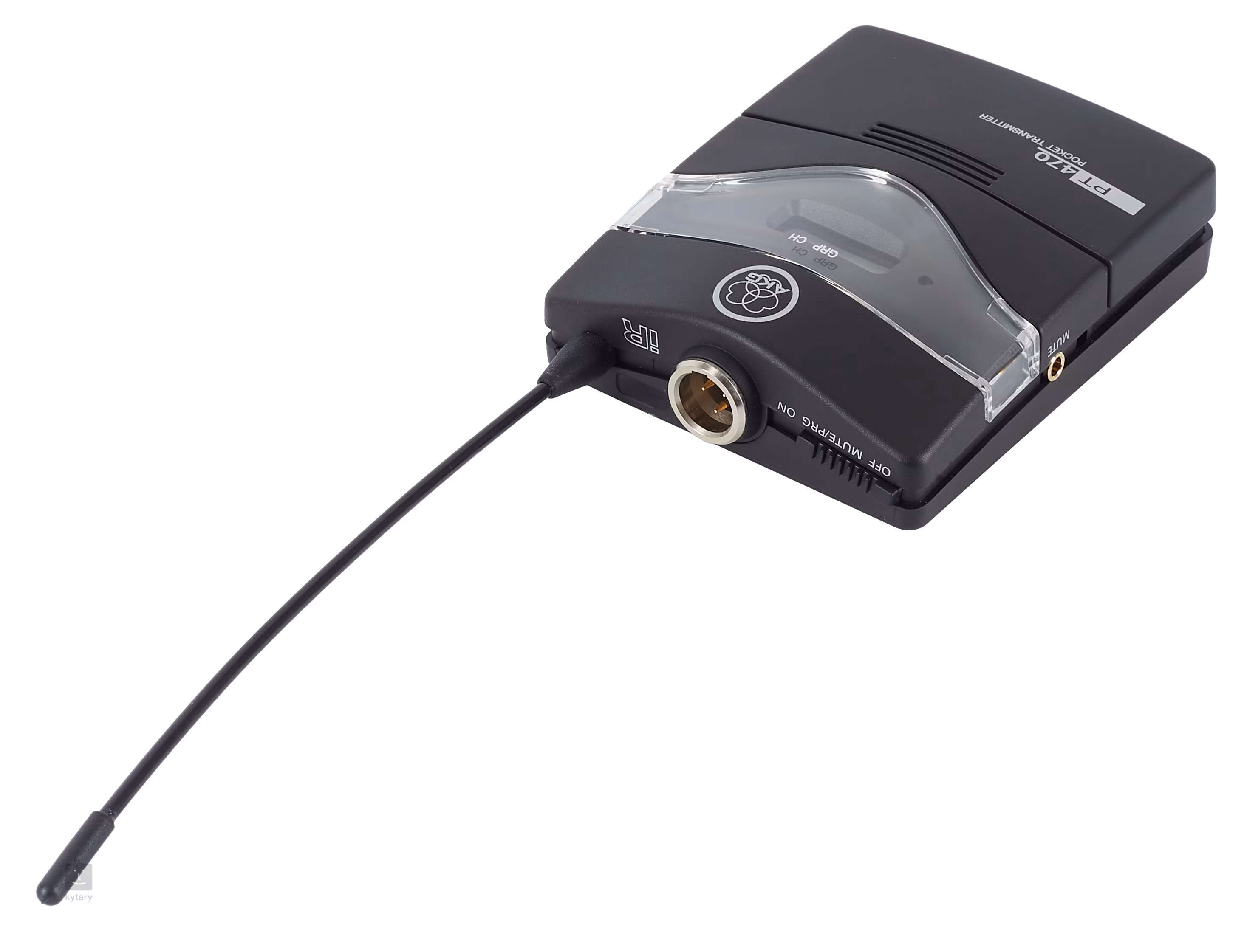 L'émetteur de poche est utilisé pour connecter des microphones de revers, des instruments et d'autres sources sonores. Il dispose d'un port infrarouge pour une connexion rapide au récepteur. Il est alimenté par une batterie au lithium qui dure jusqu'a 14 heures. Un écran informe de l'état de la batterie.