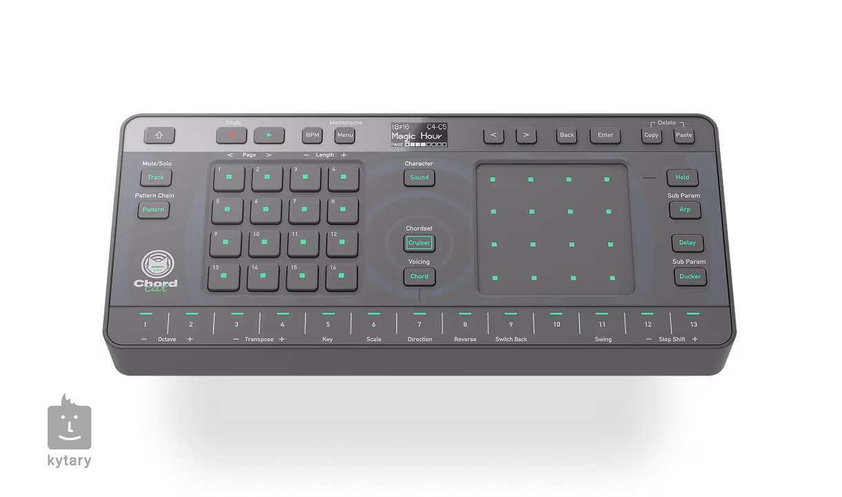 Chordcat offre un large espace de travail - 8 pistes, 16 motifs et 128 pas - garantissant un contrôle total sur l'arrangement. Chaque piste peut être mixée individuellement, balancée et liée pour créer des compositions complexes. Il y a des entrées/sorties/THRU MIDI et USB-C pour une intégration facile avec des synthétiseurs externes, des DAW et d'autres technologies. Le logiciel Chordcat Manager permet d'importer et d'exporter facilement des motifs entre l'appareil et votre ordinateur. De plus, Ableton Live Lite est inclus pour élargir les possibilités de production.