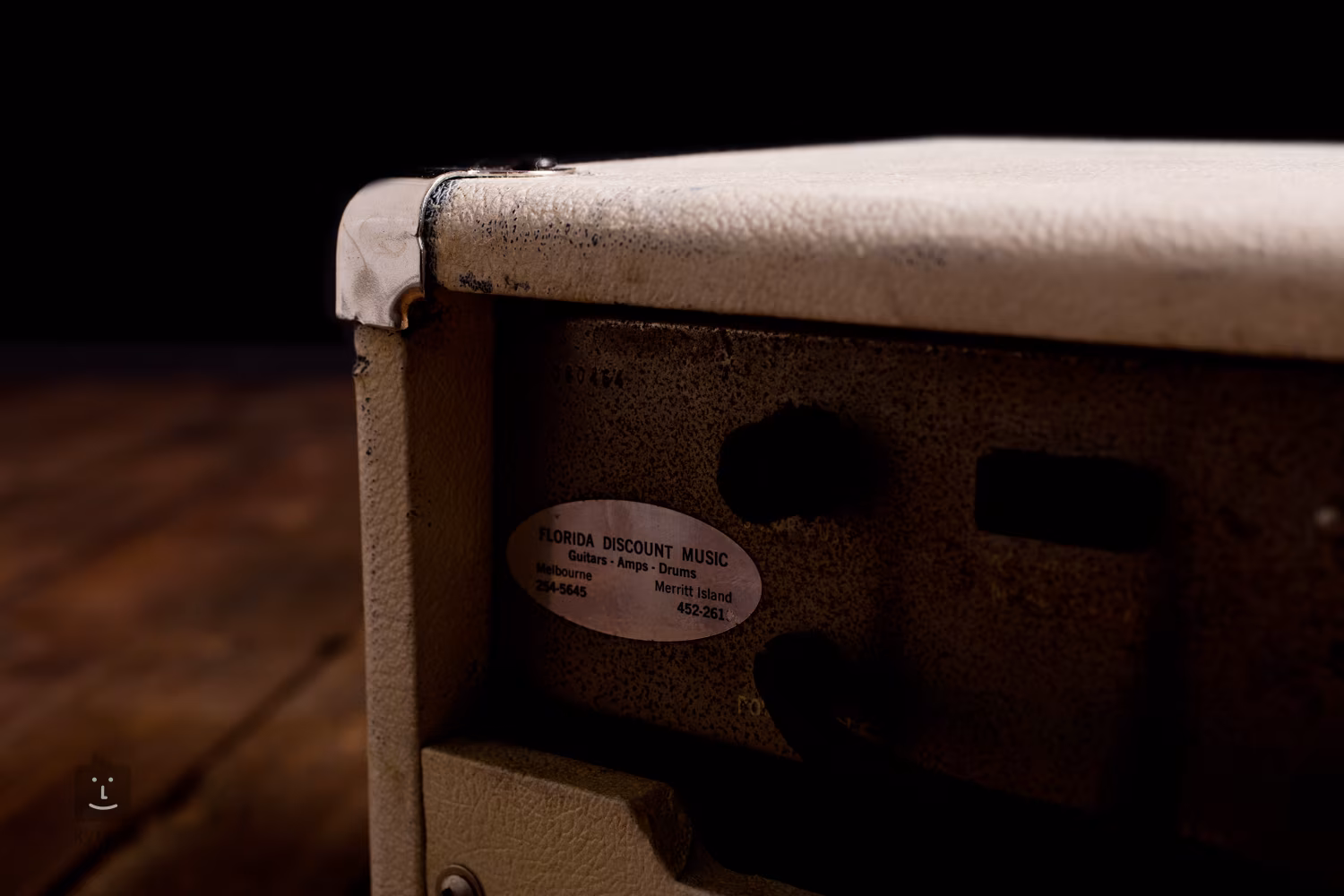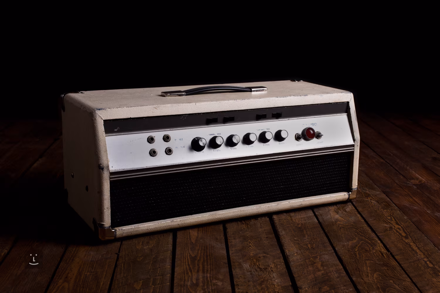 Cette pièce particulière date de 1968, c'est donc l'un des premiers exemples de ce modèle. Au cours de sa longue vie, il est possible que son revêtement en similicuir ait été peint en blanc. Apparemment, cela correspondait au look du groupe sur scène. Le lettrage sur le panneau avant a partiellement disparu avec l'usage. Récemment, l'instrument a été entièrement révisé, plusieurs condensateurs ont été remplacés (souvent un remplacement nécessaire qui n'affecte pas le son final), il a un nouveau potentiomètre de polarisation, un meilleur ajustement du châssis dans la boîte, un nouveau bouton ou une énorme diode rouge. Les transformateurs d'origine sont tous deux des composants qui ont un effet important sur le son de l'ampli. L'ampli fonctionne sur du 110V US, il faut donc le connecter à un convertisseur de tension, celui-ci est inclus dans la vente.