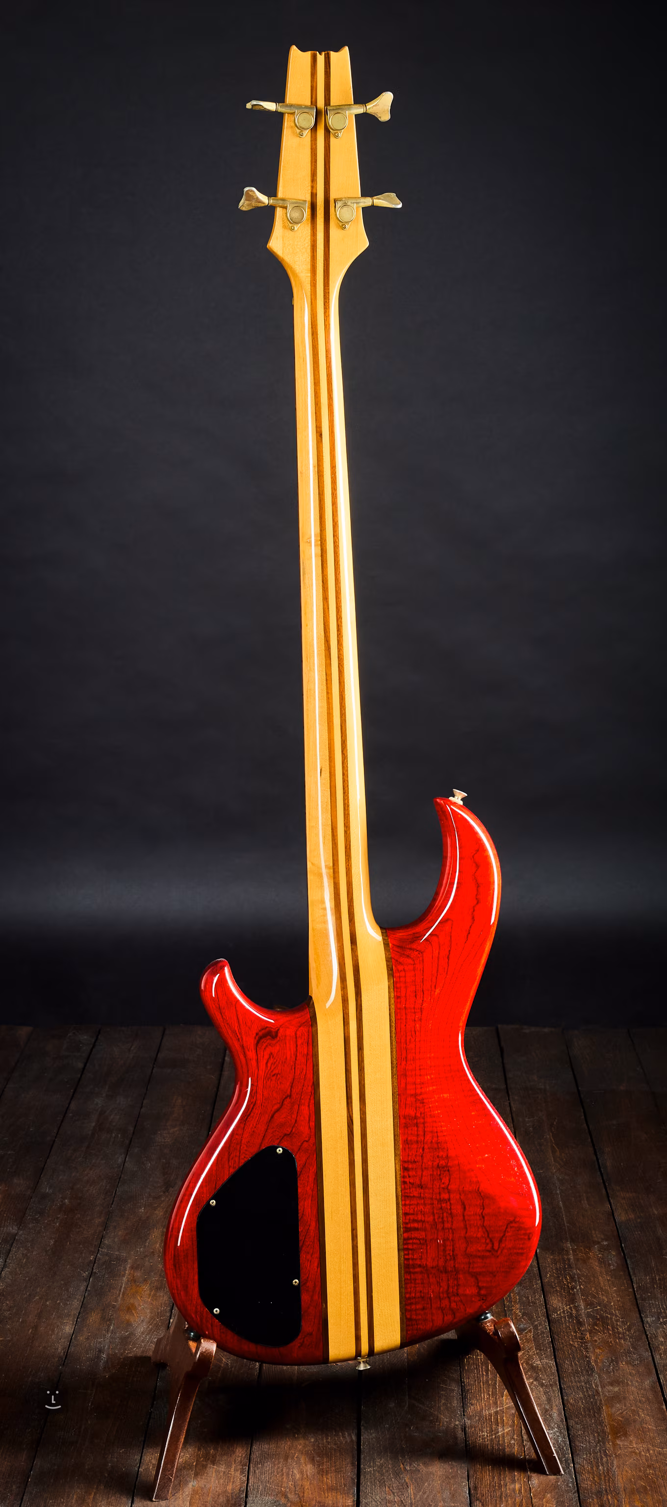Le corps est en foin japonais (les ailes sont peintes en rouge transparent). Le manche est composé de 5 couches d'érable et de noyer. La touche est en palissandre avec 24 frettes, la menuure est la longue classique de 34".
