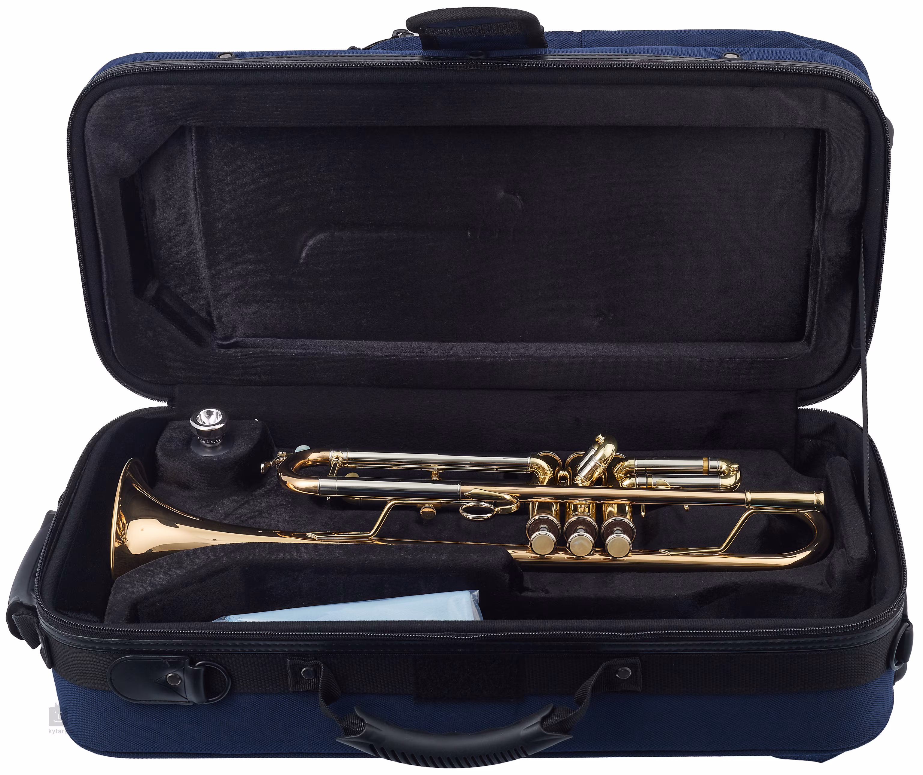 Cette trompette Sib est fabriquée en laiton. Elle est équipée d'un bec et d'une table d'harmonie en laiton doré, de pistons en acier taillés à la main, de deux pistons à eau, d'un crochet pour le pouce sur les premiers graves et d'un anneau pour le doigt sur les troisièmes graves. Elle est livrée avec un étui et une embouchure 7C.