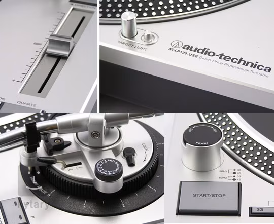 This professional stereo turntable features a high-torque direct-drive motor for quick start-ups and a USB output that connects directly to your computer. Other features include: forward and reverse play capability; cast aluminum platter with slip mat and a start/stop button; three speeds 33/45/78; selectable high-accuracy quartz-controlled pitch lock and pitch change slider control with +/-10% or +/-20% adjustment ranges; and removable hinged dust cover. A selectable internal stereo phono pre-amplifier allows the turntable to plug directly to components with no dedicated turntable input. A USB cable and adapter cables are included along with Mac- and PC-compatible Audacity software to digitize your LPs. The AT-LP120USB does not come with a cartridge but is compatible with all Audio-Technica cartridges and any 1 inch mount cartridge from other manufacturers.