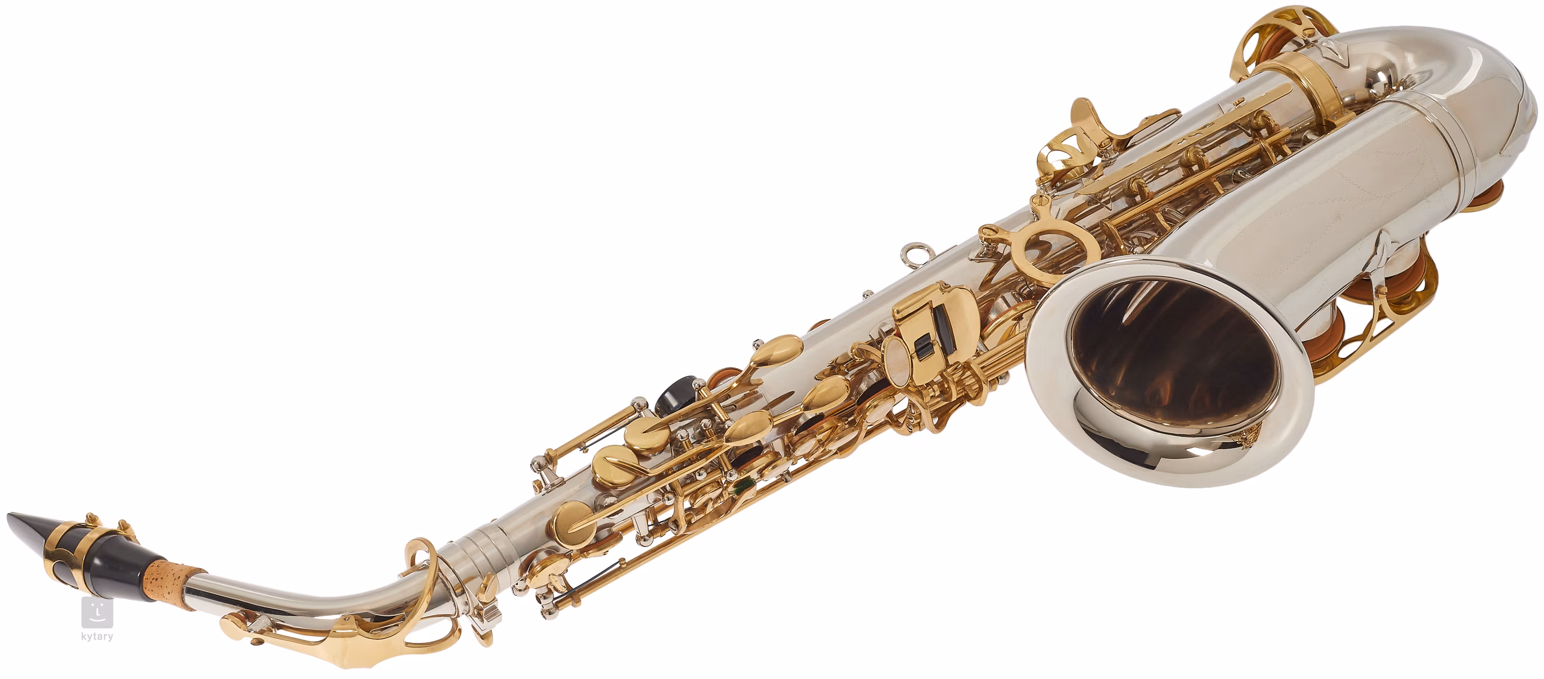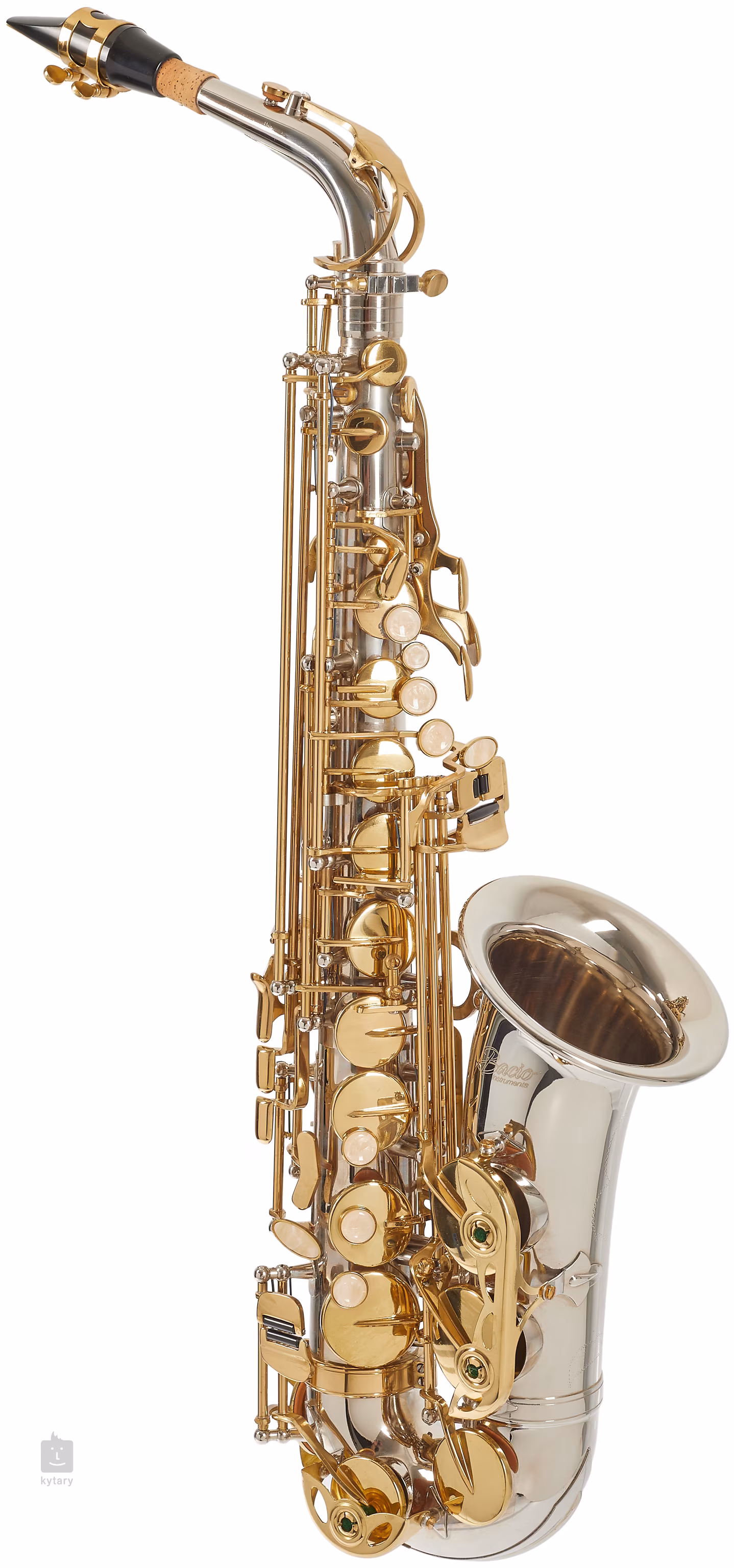 Saxophone alto BAS-100N avec corps en laiton nickelé et volets plaqués or. Le saxophone est livré dans un étui avec une embouchure, une ligature et des accessoires.