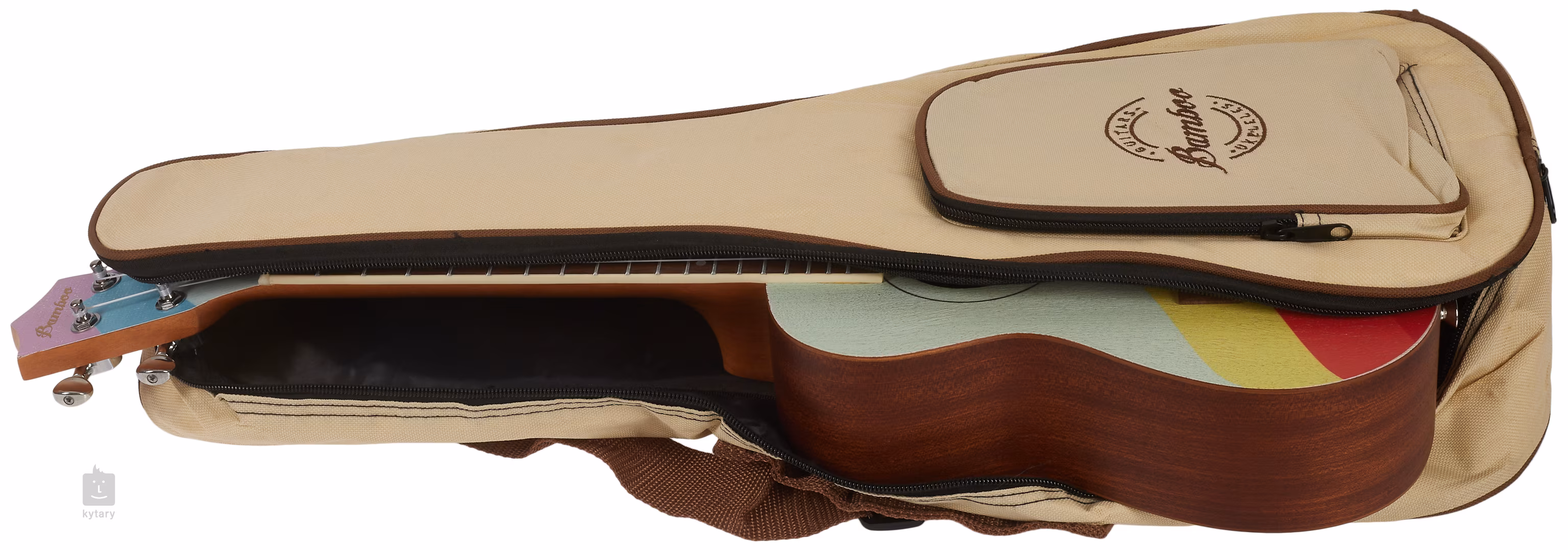 La ligne New Generation de Bamboo propose des ukulélés abordables dans les tailles concert et soprano, ornés de motifs graphiques colorés. Le corps de l'ukulélé de concert U-23 UNIVERSAL PARADISE-S est en sapelli laminé. Une touche en noyer munie de dix-huit frettes est collée sur le manche en okoumé. Les cordes sont ancrées par l'intermédiaire d'une touche en os et d'un sillet de chevalet dans les mécaniques open-top de l'entreprise et la touche en noyer. L'instrument est livré dans un étui.