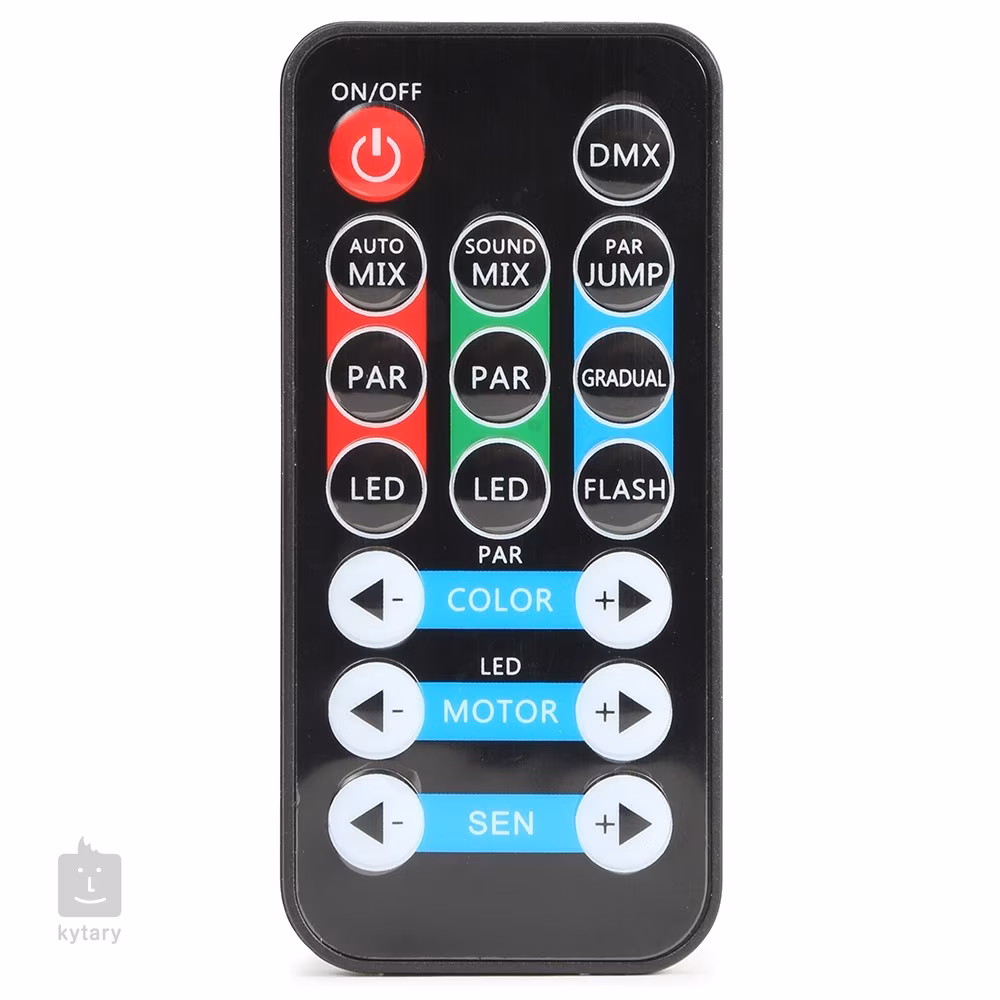 L'effet peut être contrôlé via un signal DMX (3, 6 ou 15 canaux) ou via le microphone intégré à sensibilité réglable, qui peut se synchroniser avec le rythme de la musique jouée. Il existe également un mode de fonctionnement automatique avec la possibilité de régler la vitesse d'exécution du programme et le contrôle via une télécommande IR. Le panneau de commande arrière comporte quatre boutons et un écran LED pour le réglage de l'adresse DMX. Des supports de montage sont également inclus pour fixer l'appareil sur un trépied. Un trépied est également inclus.