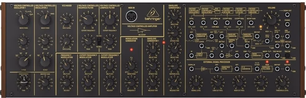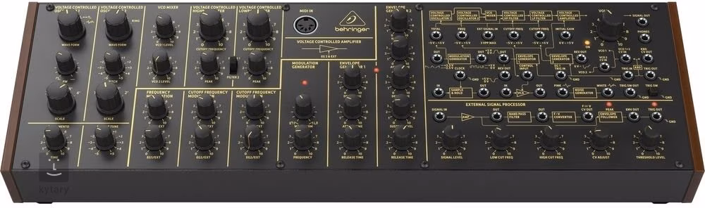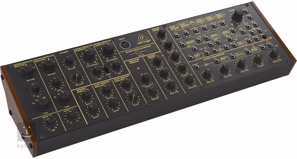 Comme un véritable synthétiseur analogique, il contient d'innombrables filtres et effets qui sont clairement disposés sur le vaste panneau de commande. Vous y trouverez un double VCO avec quatre formes d'ondes et une modulation en anneau, un VCF, un VCA, des filtres High/Low ou deux générateurs d'enveloppe. Le panneau de contrôle avec 36 potentiomètres comprend également des contrôles pour les touches MIDI connectées, ce qui vous offre une flexibilité maximale.