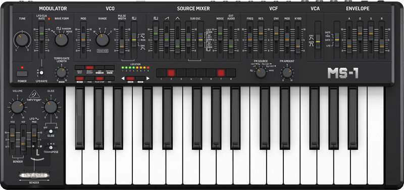 Le MS-1 dispose de 32 touches semi-lestées de taille standard avec une attaque ultra-rapide. Vos doigts danseront gracieusement sur le clavier comme des ballerines du Théâtre national. Tout bon synthétiseur analogique comprend d'innombrables filtres et effets, et le MS-1 les a tous bien rangés sur son vaste panneau de contrôle. Vous contrôlez tous les filtres à l'aide de faders mobiles, qui sont soigneusement divisés en sections distinctes. Vous pouvez enrichir votre jeu solo avec l'arpégiateur intégré ou la molette Pitchbend/Modulation. Un séquenceur à 32 pas avec 64 positions de séquençage vous offre une visibilité maximale lorsque vous jouez et composez.