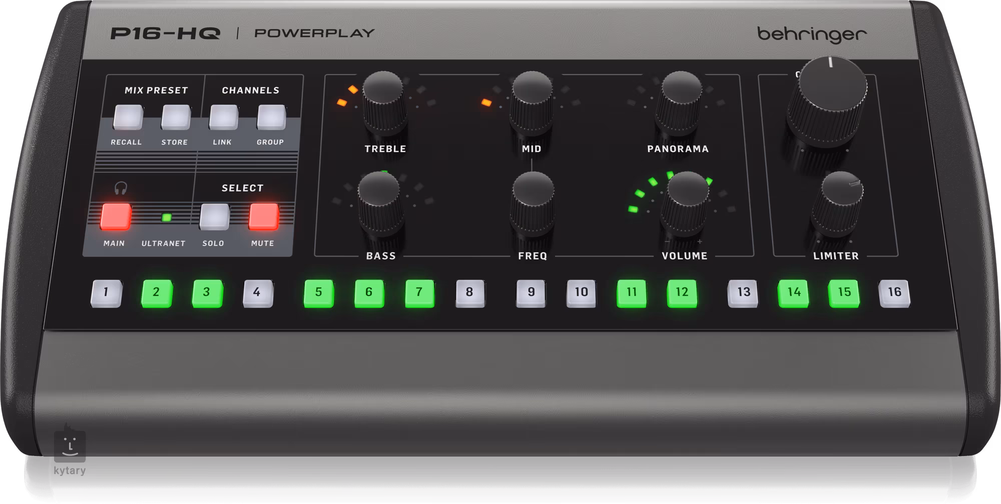 Options de contrôle et de réglage > Créez facilement des mixages de retour personnalisés de la plus haute qualité à partir d'un signal d'entrée à 16 canaux. > Fréquence de bande moyenne réglable sur le canal principal > Fonctions Solo et Mute sur chaque canal > égaliseur à trois bandes sur chaque canal > sortie ligne mono/stéréo supplémentaire pour les enceintes de monitoring actives > connexion via un seul câble Ultranet CAT5e > P16-HQ peut être connecté en guirlande ou à des concentrateurs P16-D > alimentation fantôme via Ultranet ou alimentation CC externe (incluse) > latence très faible du système (moins de 1 ms) > montage sécurisé sur pied de microphone avec P16-MB (non inclus) > entrée MIDI avec contrôle à distance en temps réel à partir d'appareils MIDI externes > compatibilité totale avec les consoles de mixage personnelles Behringer P16-M