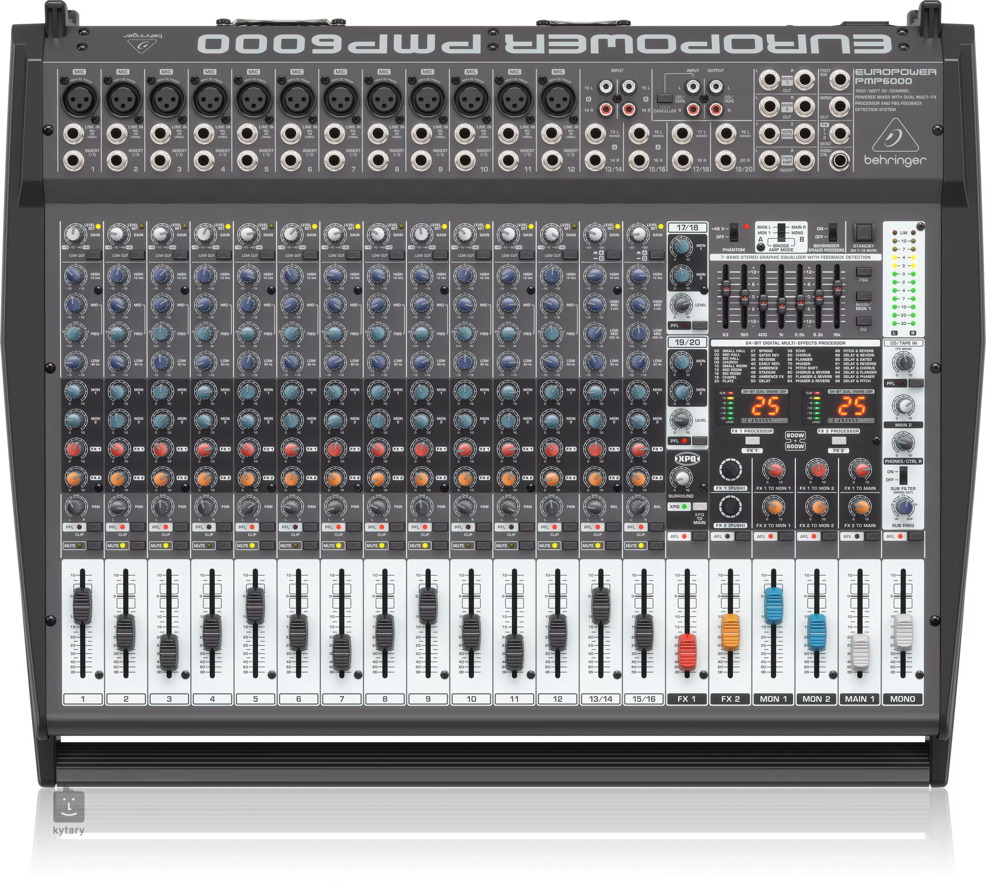 La Behringer PMP6000 est une console de mixage dotée d'un amplificateur, de 20 entrées, d'une double unité d'effets et d'une détection du retour de fréquence. L'amplificateur de classe D offre une puissance de 1600 watts, ce qui fait de cette console une solution tout-en-un idéale.