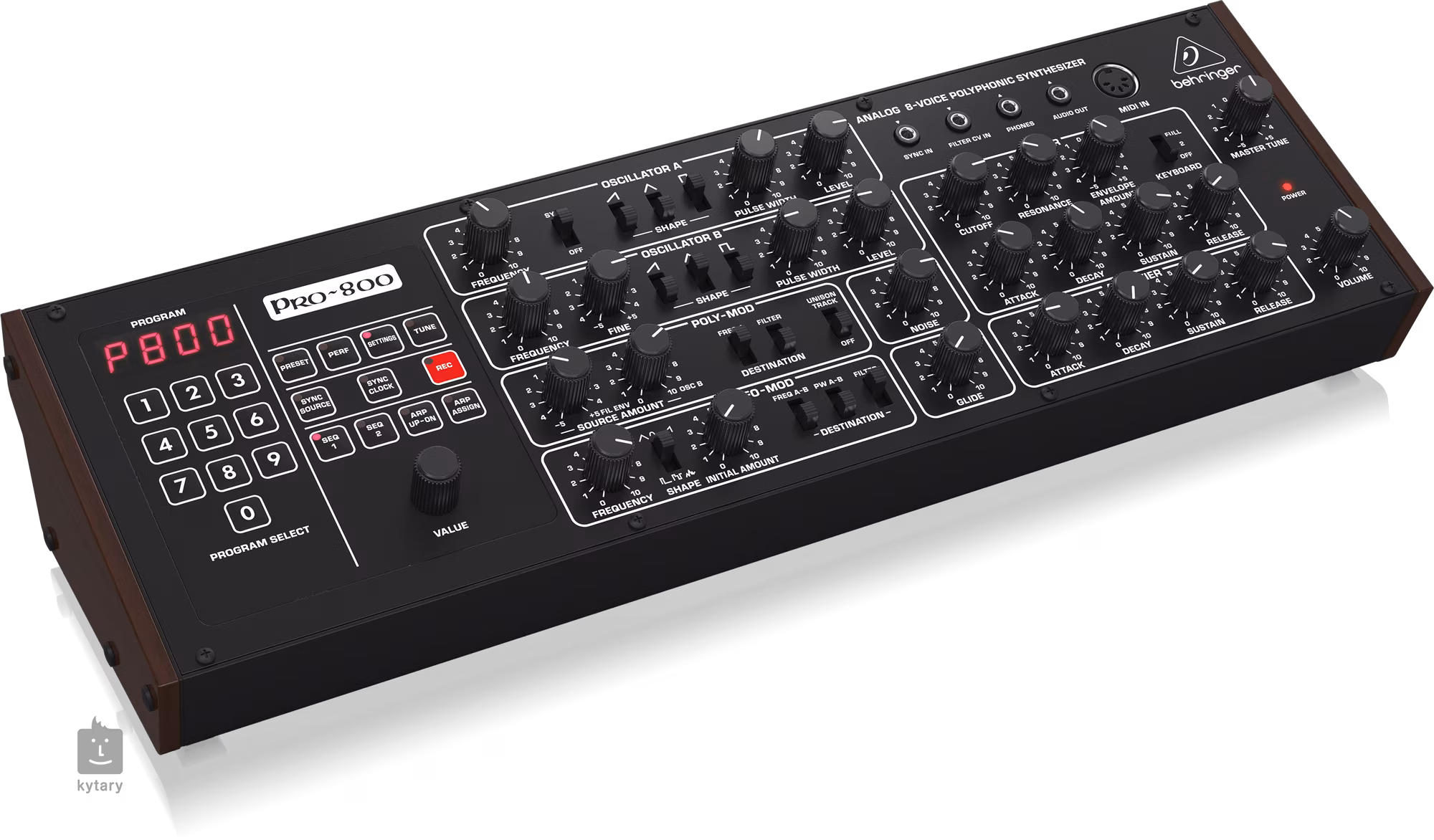 Le Behringer Pro-800 est un synthétiseur qui s'impose dans le monde de la musique électronique grâce à sa riche palette de possibilités sonores. Chaque voix de cet instrument est générée par deux oscillateurs, chacun offrant un choix de trois formes d'ondes : dent de scie, triangle et carré, avec des contrôles de largeur d'impulsion et de niveau. L'instrument comporte également un filtre passe-bas (-24 dB/oct.) avec contrôle de la résonance, modulation d'enveloppe et suivi de touche, permettant au fabricant de façonner avec précision le caractère du son. Il ajoute également un générateur de bruit et un LFO avec six formes d'onde et destinations de modulation sélectionnables (hauteur, largeur d'impulsion et fréquence du filtre).