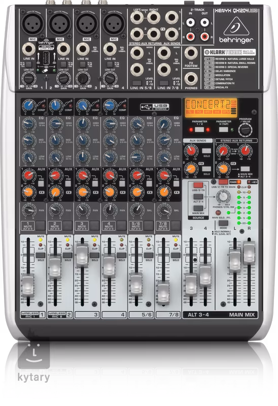 La XENYX QX1204USB est une console de mixage analogique dotée d'une interface USB, d'un compresseur intégré, de deux sous-groupes, de deux départs FX (post et pré) sur tous les canaux et d'une unité d'effets Klark Teknik.