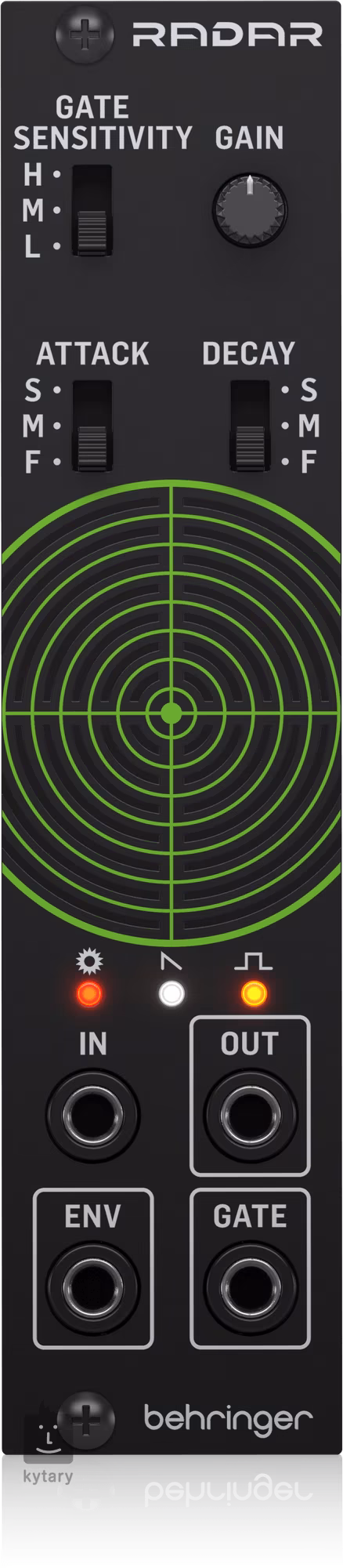 Le Behringer Radar est un module Eurorack créatif qui intègre un microphone sensible qui détecte la surface tactile (cible) du châssis pour le finger drumming et le scratching. Un préampli intégré avec un gain allant jusqu'à 50dB convertit ensuite ces signaux acoustiques en rythmes, sons ambiants et harmoniques, et bien sûr il y a une offre directe pour le connecter à d'autres éléments modulaires de votre configuration Eurorack. Le capteur RADAR est même assez sensible pour capter toutes les ondes acoustiques ambiantes, qu'il s'agisse de coups sur un meuble modulaire, d'un batteur frappant une caisse claire, ou même de sons provenant de vos haut-parleurs. Vous pouvez ensuite convertir ces sons en signaux de gate ou d'enveloppe et les ajuster à l'aide des commandes Gate Sensitivity et Attack et Decay respectivement.