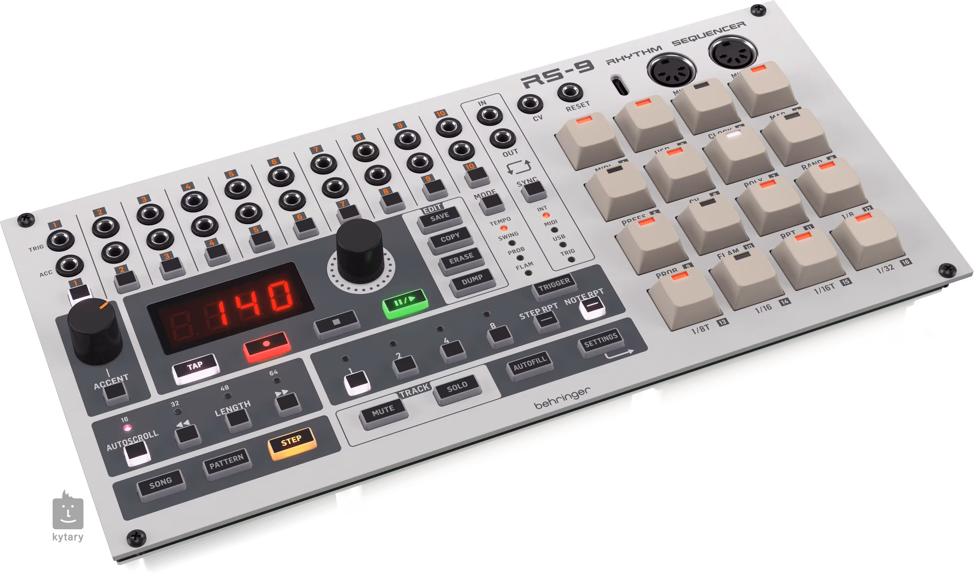 Le Behringer RS-9 est une combinaison d'un séquenceur rythmique à 64 pas et d'un mixage de batterie à 10 canaux.