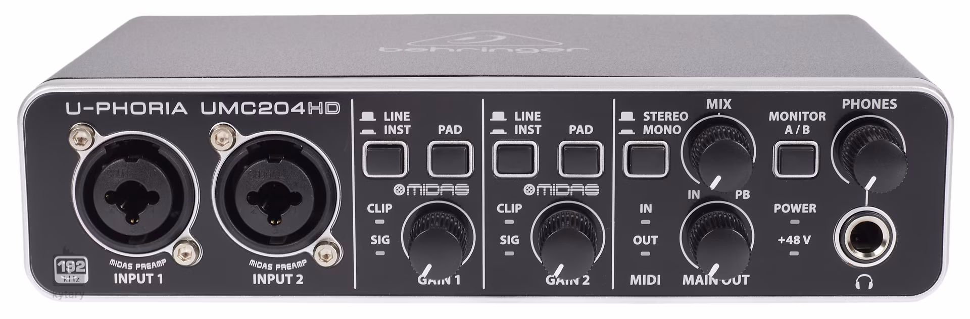 La carte son est compatible avec la plupart des logiciels DAW ou des plugins ou instruments virtuels. Sur la face avant, vous trouverez deux entrées combinées pour microphone ou instrument de musique, dotées d'un préamplificateur de microphone MIDAS de haute qualité avec une large gamme dynamique. Chaque canal comprend un réglage de volume, des commutateurs Line/Inst, des voyants PAD et CLIP/SIC pour un contrôle maximal. Une sortie casque avec un contrôle de volume séparé vous permet ensuite d'effectuer un monitoring détaillé ou une session d'enregistrement nocturne. Le panneau arriere cache une connectivité flexible sous la forme de sorties stéréo pour les moniteurs de studio, de deux insertions analogiques ou de deux paires de sorties RCA stéréo pour diviser le signal en sources A/B, ce qui sera particulierement apprécié par les DJ et les musiciens lors de performances en direct. Il y a également un commutateur d'alimentation fantôme, des connecteurs MIDI et un port USB pour la connexion a un PC ou un ordinateur portable.
