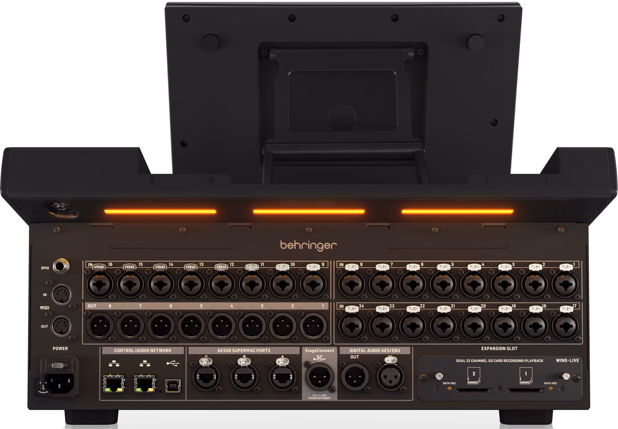 Pourquoi choisir Wing ? - La console de mixage la plus puissante dans cette gamme de prix - 48 canaux stéréo, 28 bus stéréo, extensibles à 376 entrées / 374 sorties - 8 préamplis et sorties Midas PRO, - extension facile des entrées et sorties avec StageConnect Host pro partage jusqu'à 32 canaux dans les deux sens via un XLR - Très grande puissance de calcul (40 canaux d'entrée, chacun avec deux points d'insertion, 8x auxiliaires stéréo avec une insertion FX, puissance de traitement séparée pour le gate, la dynamique et l'EQ sur chaque canal au-delà de la puissance de l'unité FX principale). - Plus de 80 plug-ins audio pour l'égalisation, la dynamique et l'édition d'effets, y compris des effets haut de gamme tels que TC M3000, Lexicon, Quantec, EMT, etc. - Résolution de 40 bits pour un traitement des effets de haute précision et une large plage dynamique - Gamme complète de périphériques numériques AES50, AES/EBU, StageConnect, MIDI, emplacements SDHC - Contrôle DAW complet avec le protocole Mackie Control Universal (MCU) compatible avec les presets pour Cubase, Ableton Live, Logic X, Nuendo, ProTools, Reaper et Studio One - Interface audio et MIDI 48 E/S intégrée avec connectivité USB - Comprend une carte d'extension Wing Live installée pour l'enregistrement et la lecture de 64 pistes - Emplacements internes et externes pour les modules d'extension Dante et Waves SoundGrid en option - firmware très avancé, stable et riche en fonctionnalités, applications natives pour Mac, PC, Linux, iOS et Android (WING-CoPilot, WING-Q, WING-Edit)