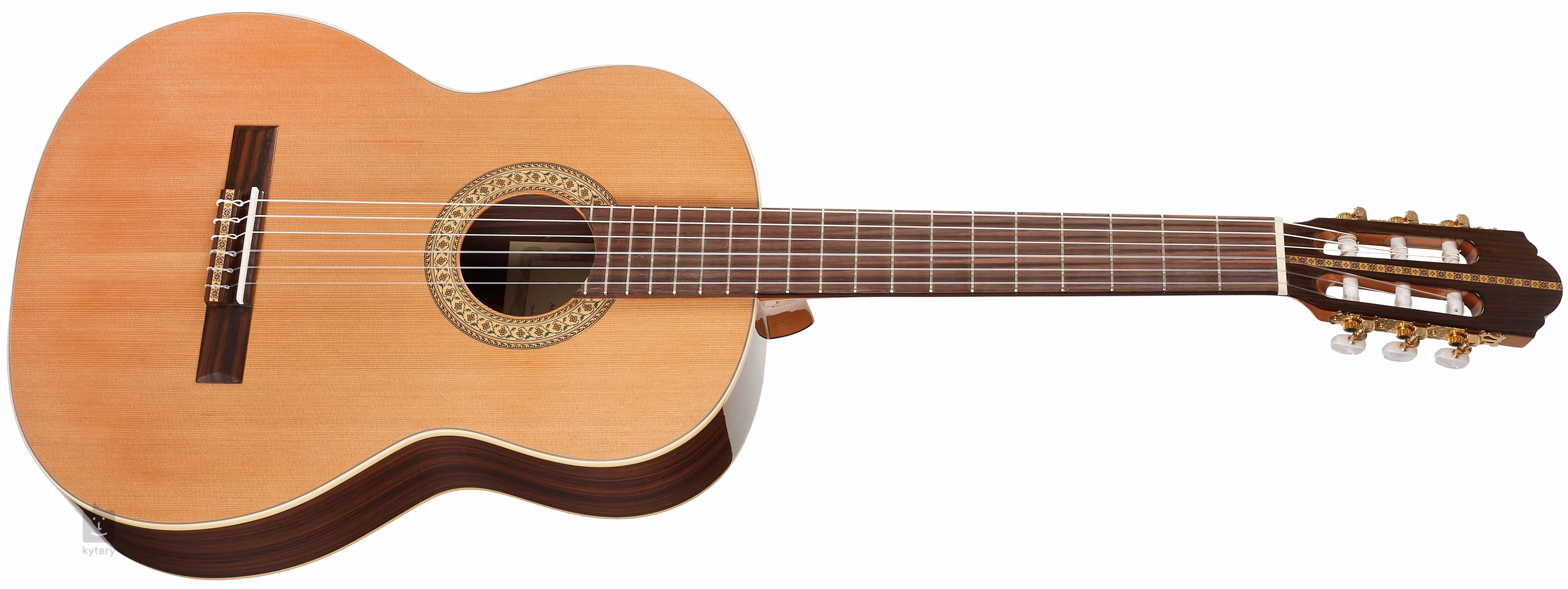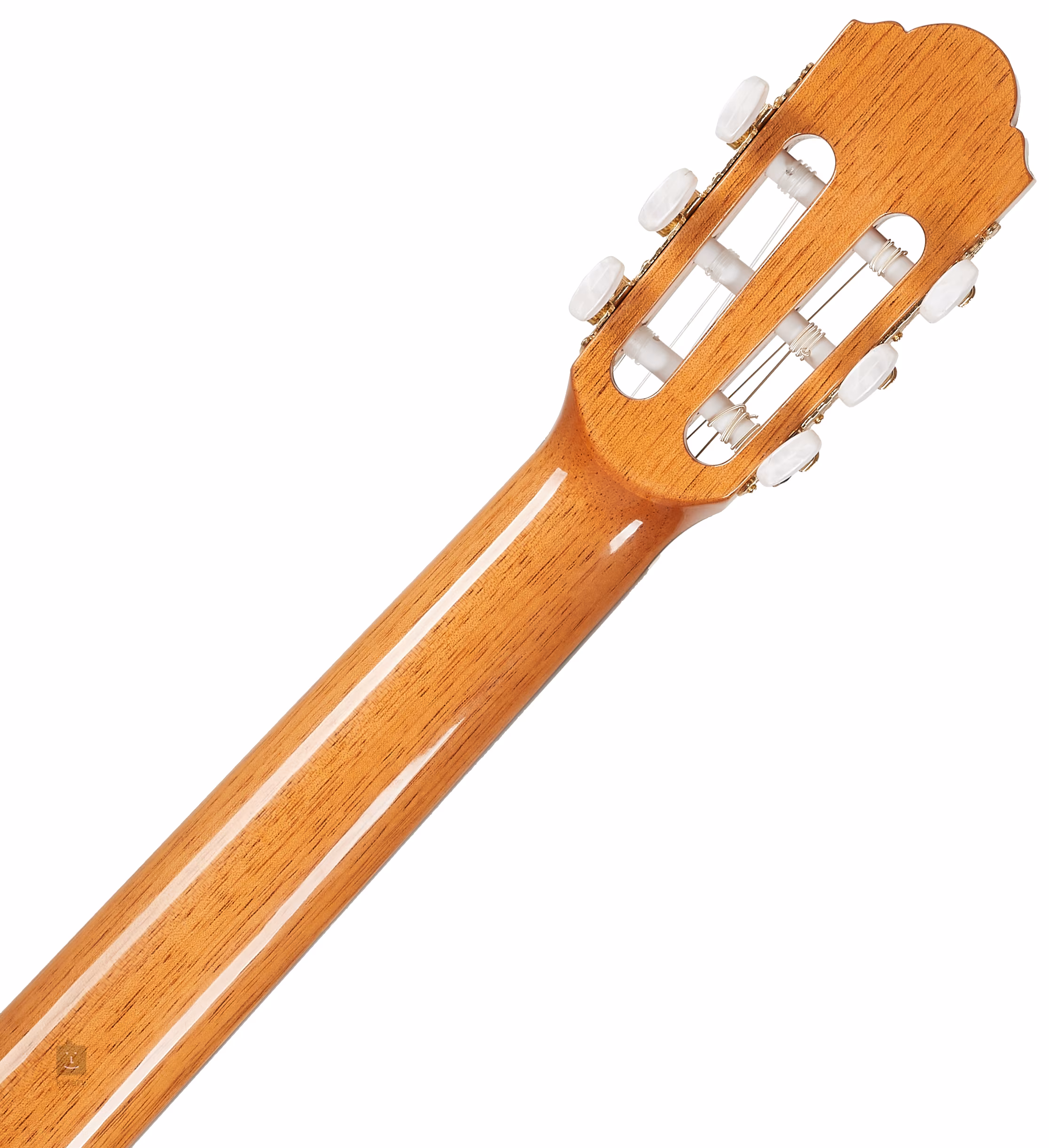 L'avant de la guitare est en cedre massif, complété par du palissandre indien en couches sur le fond et les éclisses. Collée sur le manche en cedre, la touche en palissandre est équipée de dix-neuf frettes. Les cordes sont maintenues dans des mécaniques d'accordage au design traditionnel et une touche en palissandre. La beauté de la fabrication est accentuée par la rosace décorative, la reliure du périmetre, le matériel doré et la décoration de la tete, du chevalet et de la plaque arriere.