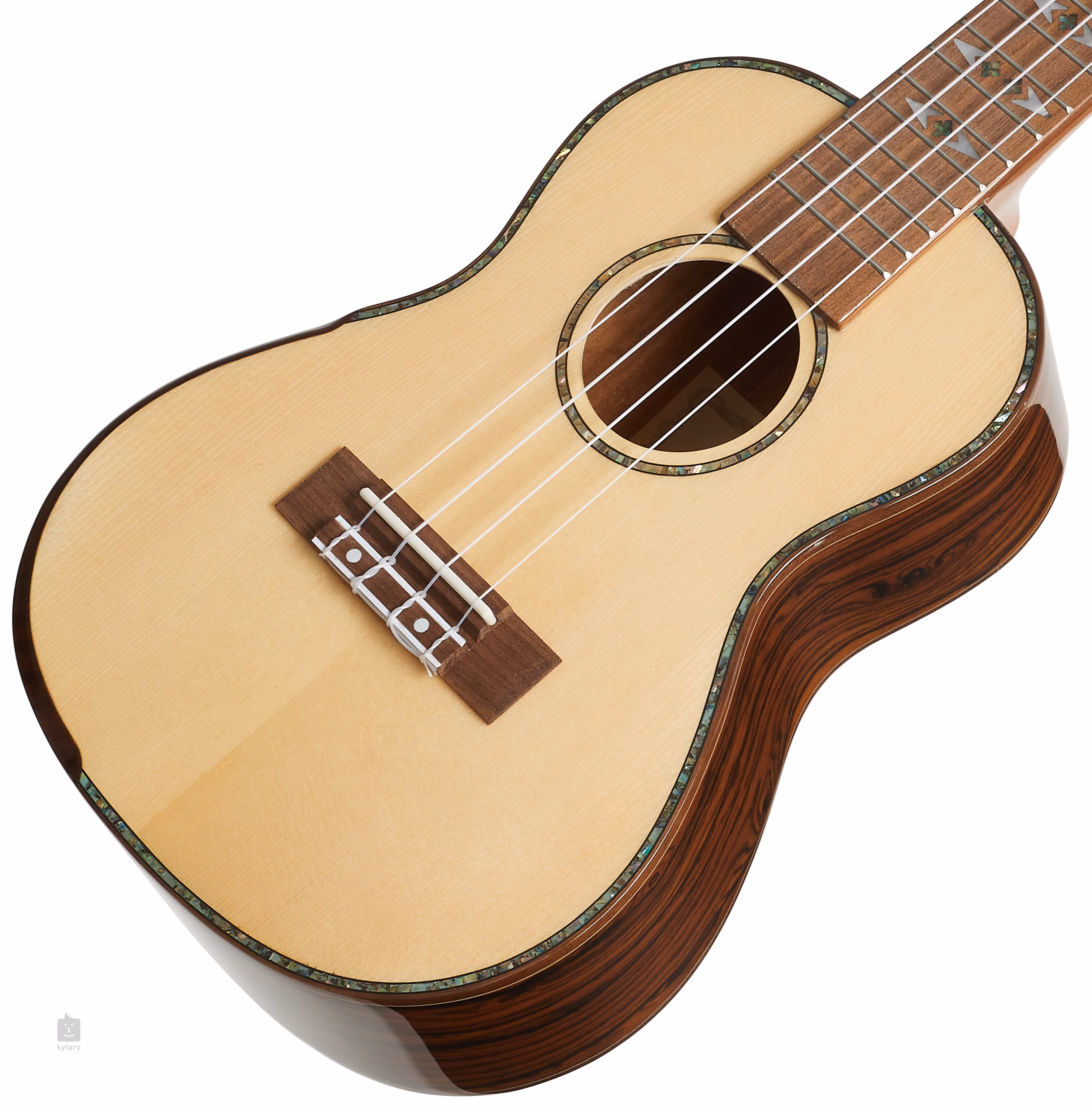 Le Blond BLO-G60-24 est un ukulélé semi-massif de taille concert avec une façade en épicéa d'Engelmann, un dos et des éclisses en bois exotique stratifié avec des veinures distinctives, et une touche et un manche en noyer noir.
