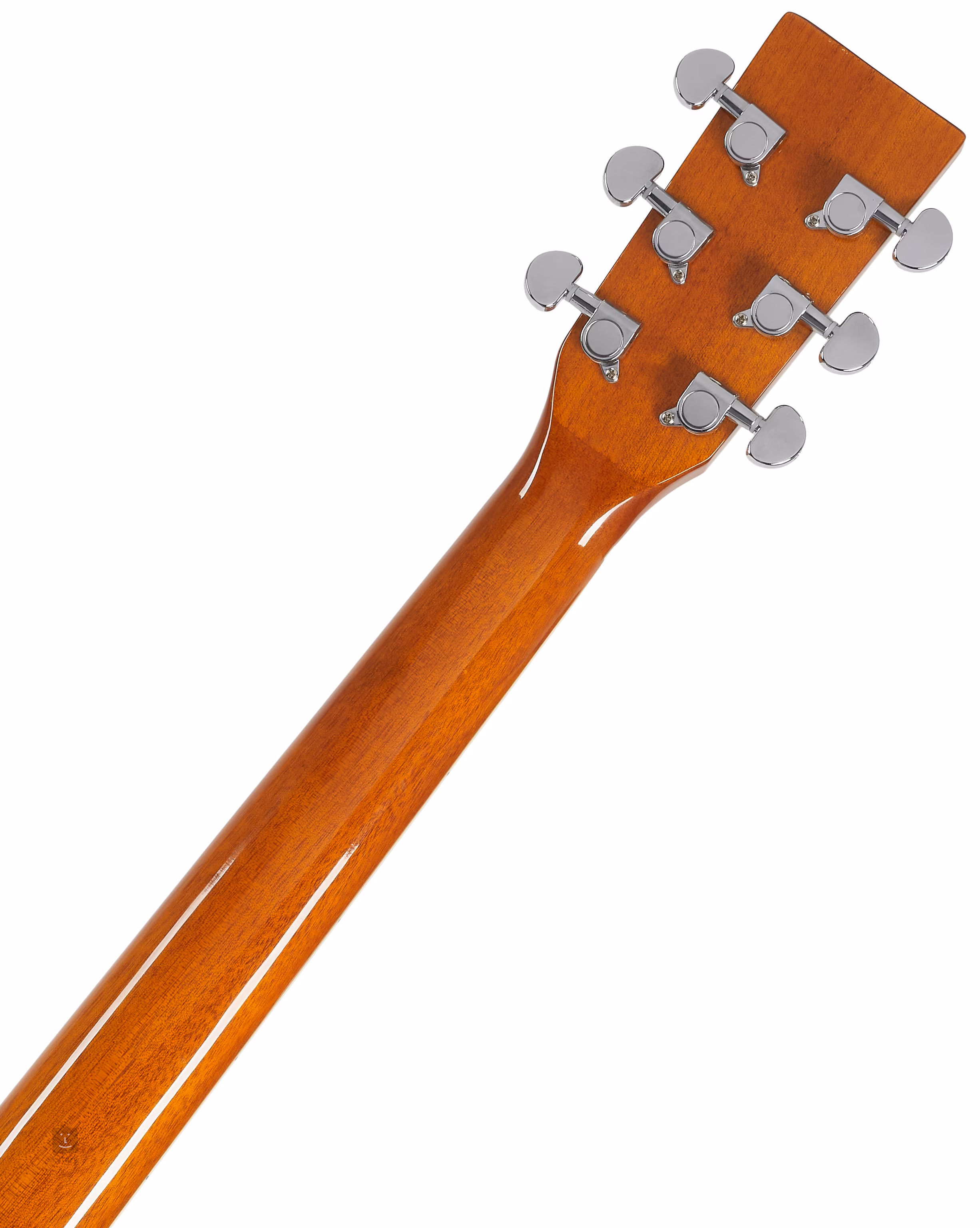 La Blond D-OA NAT est une guitare acoustique dotée d'un corps dreadnought très répandu. Elle est dotée d'une table d'harmonie en épicéa stratifié, d'un dos et d'éclisses en sapelli stratifié, d'un manche et d'une touche en acajou et d'une touche moderne en composite. Les cordes sont maintenues dans des mécaniques chromées par une frette zéro en plastique. La finition élégante est accentuée par l'application d'une laque brillante et d'éléments traditionnels sous la forme d'une bordure de table brillante (ABS) complétée par des lignes noires et blanches et d'une rosace composée de lignes noires et blanches.