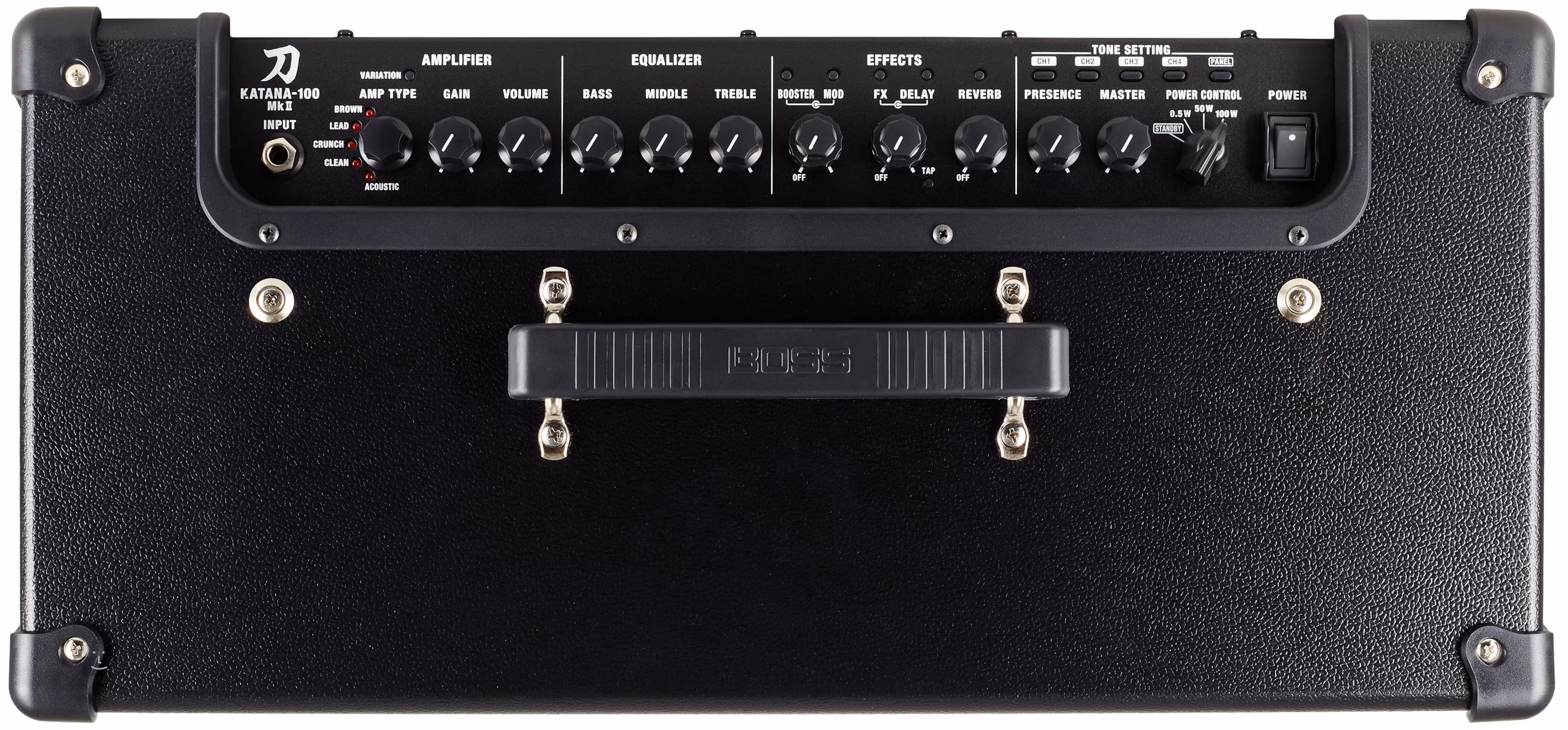 Le Katana-100 MkII est un combo de modélisation de guitare à quatre canaux de 100 W qui utilise la technologie BOSS Tube Logic pour restituer les caractéristiques de distorsion authentiques des amplis à lampes classiques. Grâce à la fonction de contrôle de la puissance (100W, 50W, 0,5W), vous pourrez profiter du son " kické " et de la réponse de la machine même au volume de la pièce.
