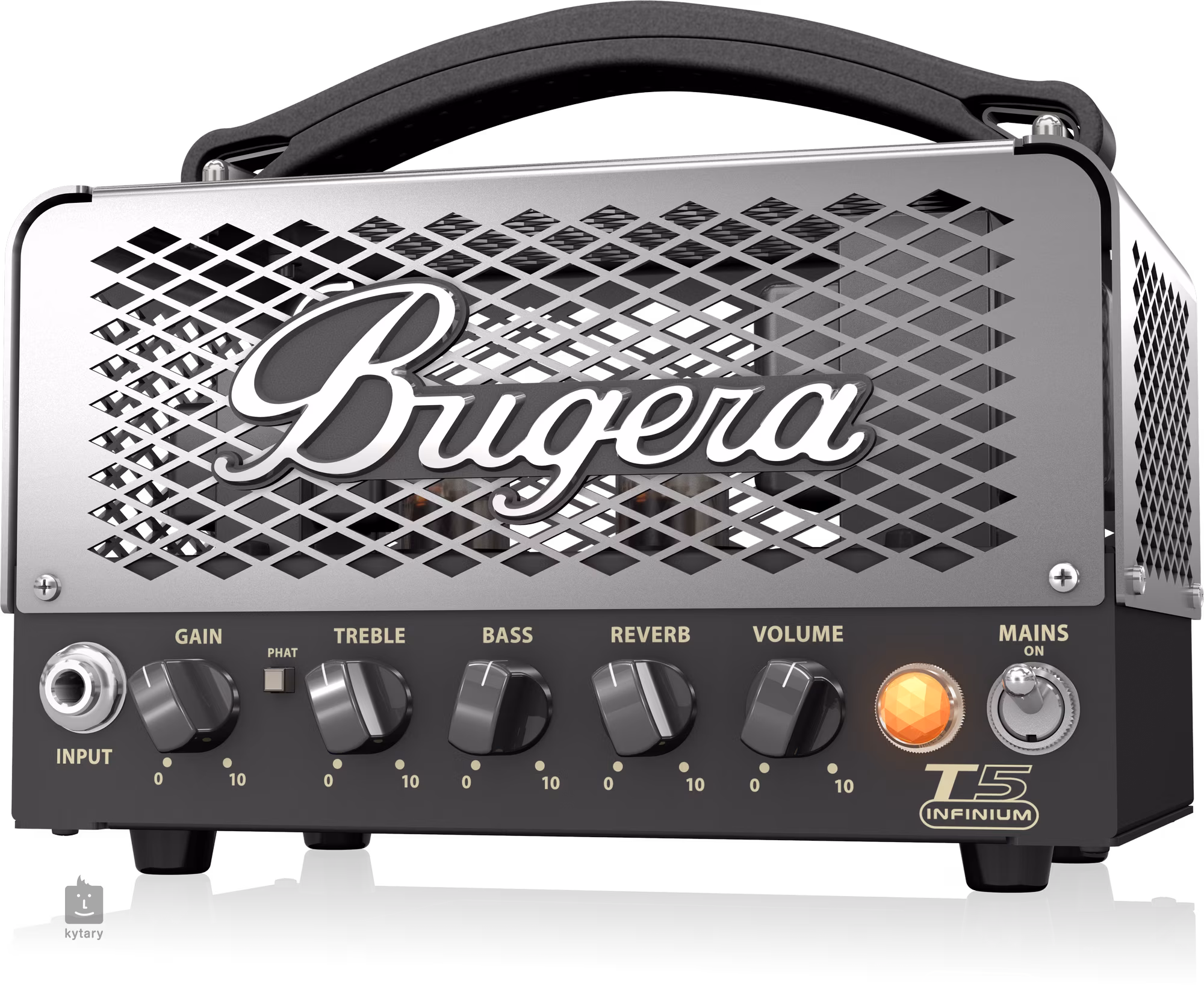 Le Bugera T5 INFINIUM est un ampli guitare à lampes compact à un canal de classe A avec puissance commutable (5, 1, 0,1 W) convenant à la pratique à domicile ou comme ampli propre pour l'enregistrement. Il offre un canal clair (tubes 12AX7 et EL84) avec un interrupteur Phat pour ajouter plus de punch rock, un égaliseur à deux bandes (basses, aigus), un effet de réverbération intégré, une sortie casque et une sortie haut-parleur avec une impédance minimale de 4 ohms. La technologie INFINIUM Tube Life Multiplier prolonge jusqu'à 20 fois la durée de vie des tubes.
