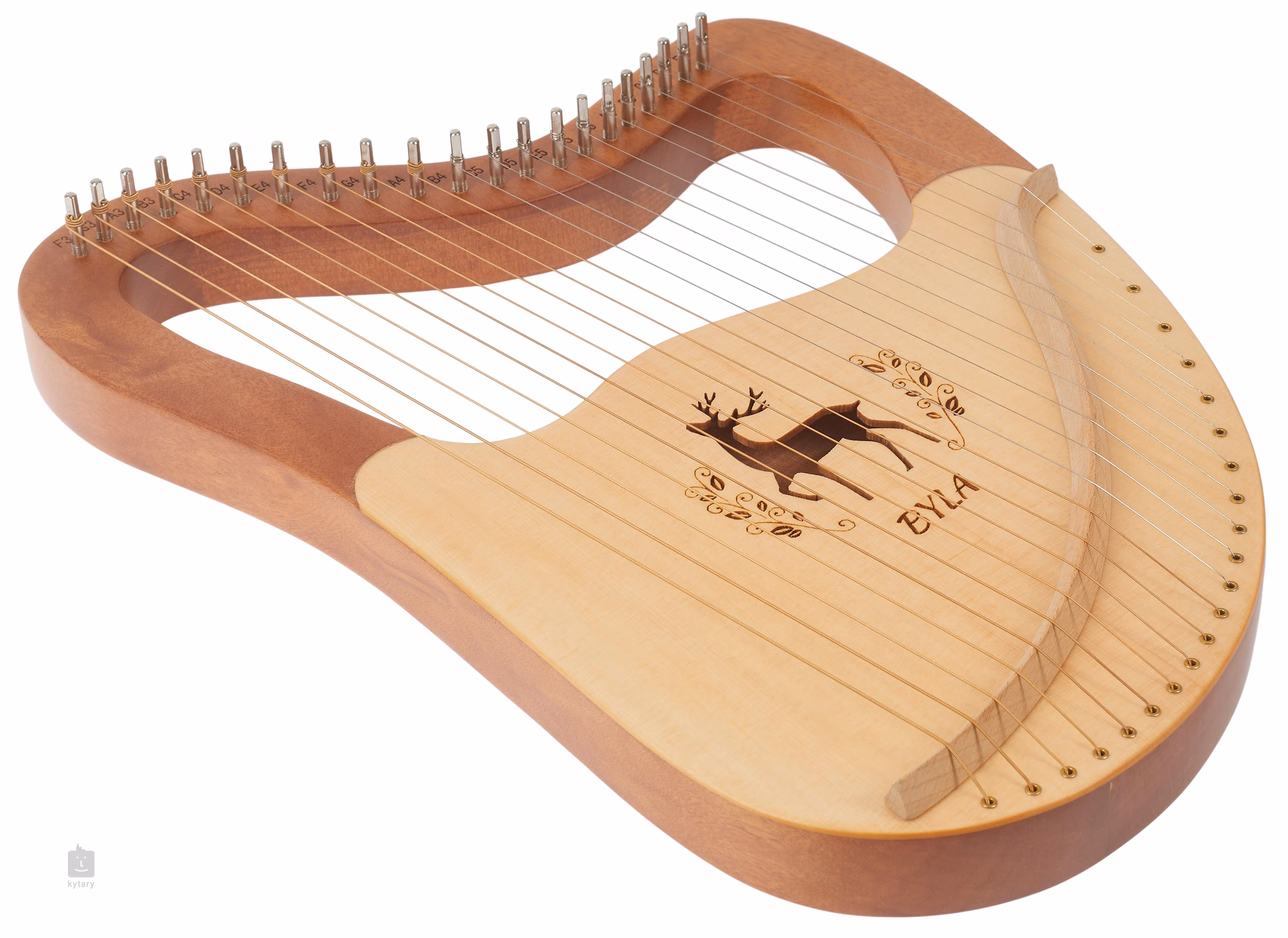 La Lyra LH21-W est de couleur naturelle, possède vingt et une cordes et est ornée d'une gravure en forme de cerf autour de la table d'harmonie.