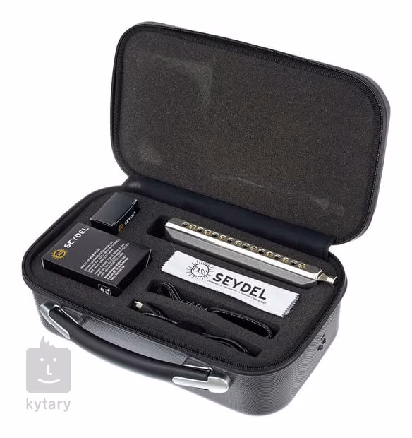 L'harmonica est livré dans un étui spécial verrouillable équipé d'un thermocouple électrique (5V/2.1A) qui empeche la condensation de l'humidité et maintient l'instrument a température ambiante, de sorte que l'harmonica est pret a etre utilisé immédiatement, a tout moment et en tout lieu. L'emballage comprend un micro-cordon d'alimentation USB, un adaptateur multiple pour tous les types de prise courants, un chargeur de voiture USB et une sangle/harnais en cuir a attacher a l'harmonica.