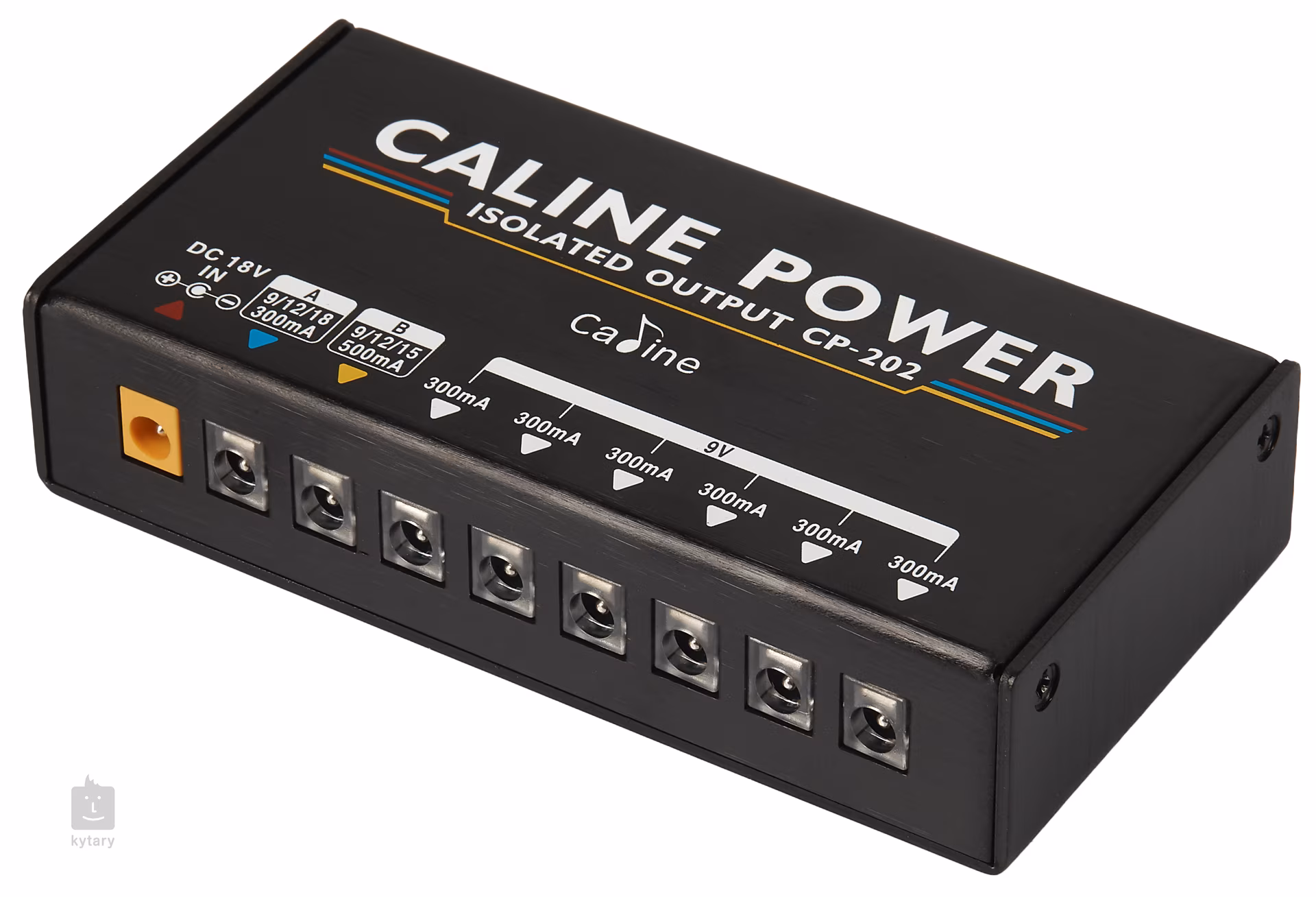 Le CP-202 est un adaptateur multiple chinois Caline qui offre huit sorties pour alimenter vos pédales d'effets - six sorties standard 9V (300 mA) et deux sorties commutables (1x 9/12/15V, 500 mA et 1x 9/12/18V, 300 mA).