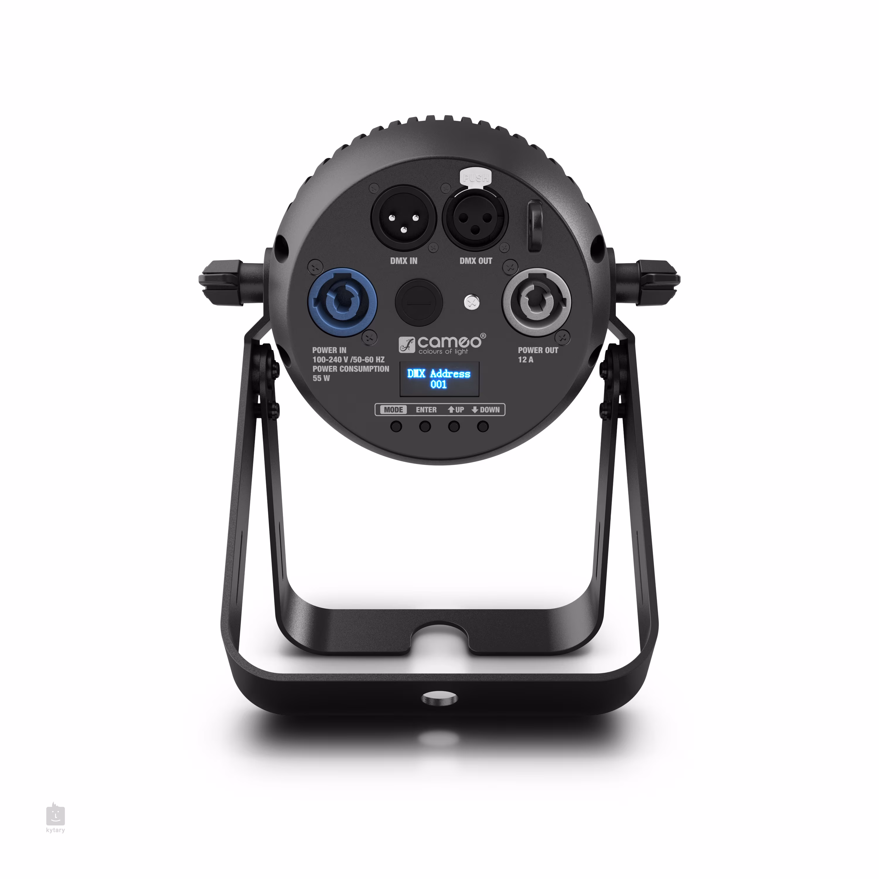 L'appareil peut être contrôlé via le protocole DMX ou RDM. Il est également possible d'utiliser la commande maître/esclave, la commande autonome ou la commande audio via le microphone intégré. Le panneau arrière comporte des connecteurs d'entrée/sortie DMX à 3 broches et des connecteurs d'entrée/sortie PowerCon pour l'alimentation et les connexions en guirlande. Il y a également un écran OLED clair et un panneau de commande à quatre boutons. L'appareil a un indice de protection IP20, ce qui le rend adapté à une utilisation en intérieur uniquement. Le projecteur peut être fourni avec une télécommande IR.