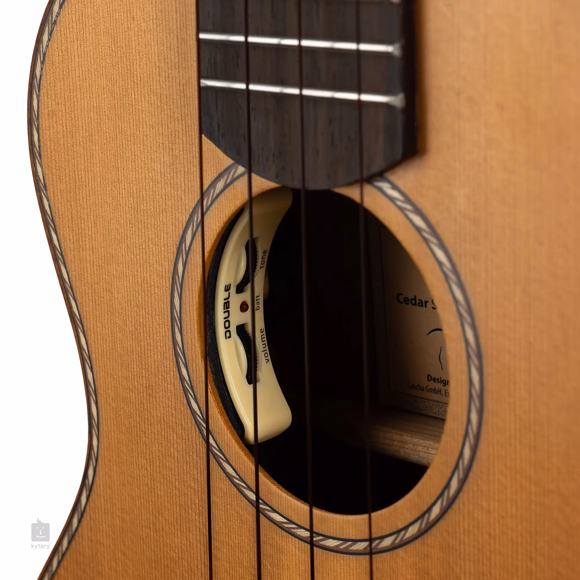 L'avant de l'ukulélé est en cèdre massif, tandis que le dos et les éclisses sont en acacia stratifié avec un motif distinctif. Le manche en okoumé est surmonté d'une touche en palissandre munie de dix-huit frettes. Les cordes sont maintenues dans des mécaniques ouvertes et une touche en palissandre par l'intermédiaire d'une touche et d'un sillet en os. La finesse de l'exécution est accentuée par les filets et la rosace en acajou, ainsi que par le panneau frontal orné d'un motif décoratif.