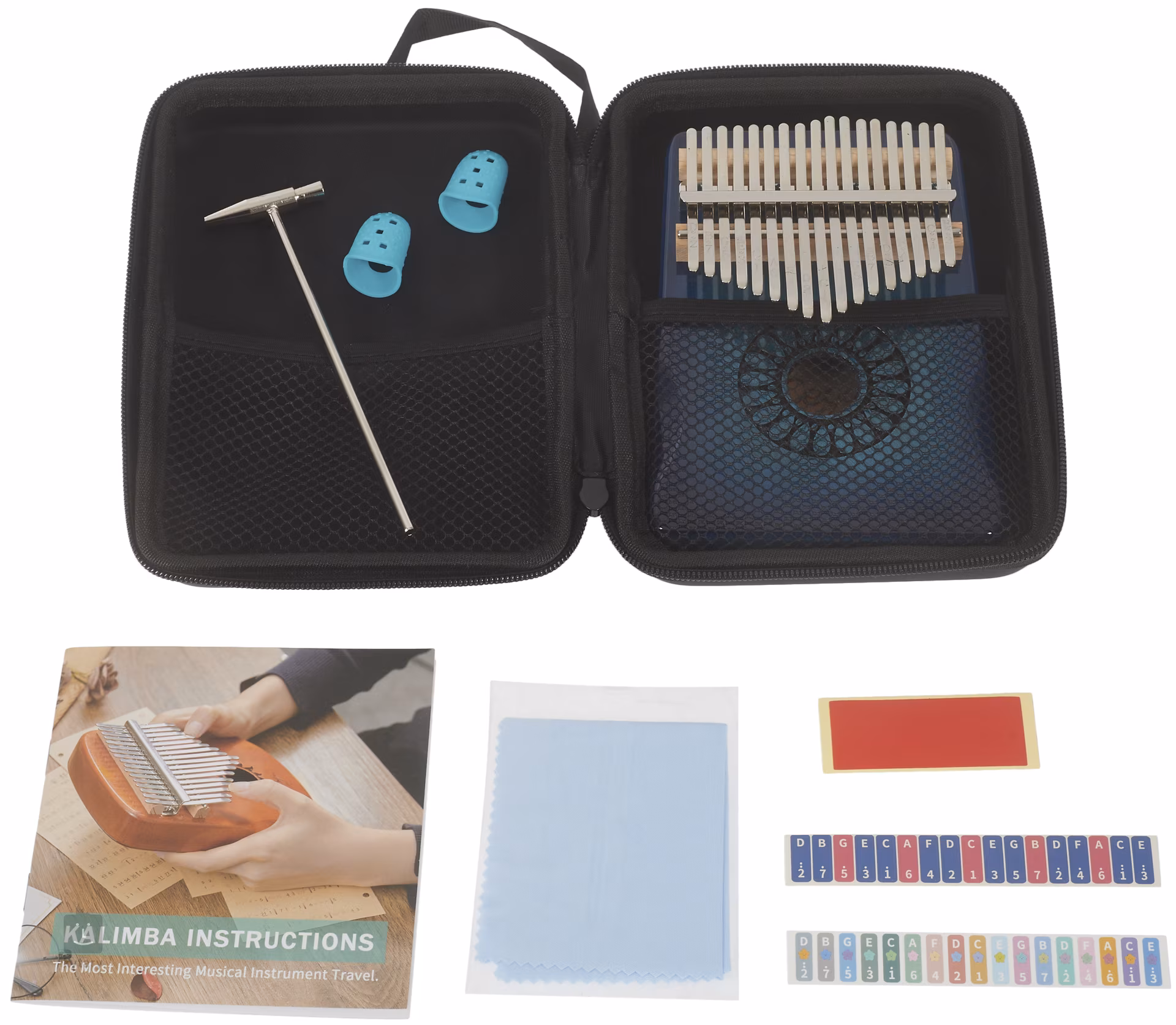Kalimba en acajou sonore, munie de dix-sept touches en acier au carbone et accordée en do. Elle est décorée d'une sculpture de gouttes autour de la table d'harmonie. Un étui de transport est inclus pour protéger l'instrument contre les dommages indésirables.