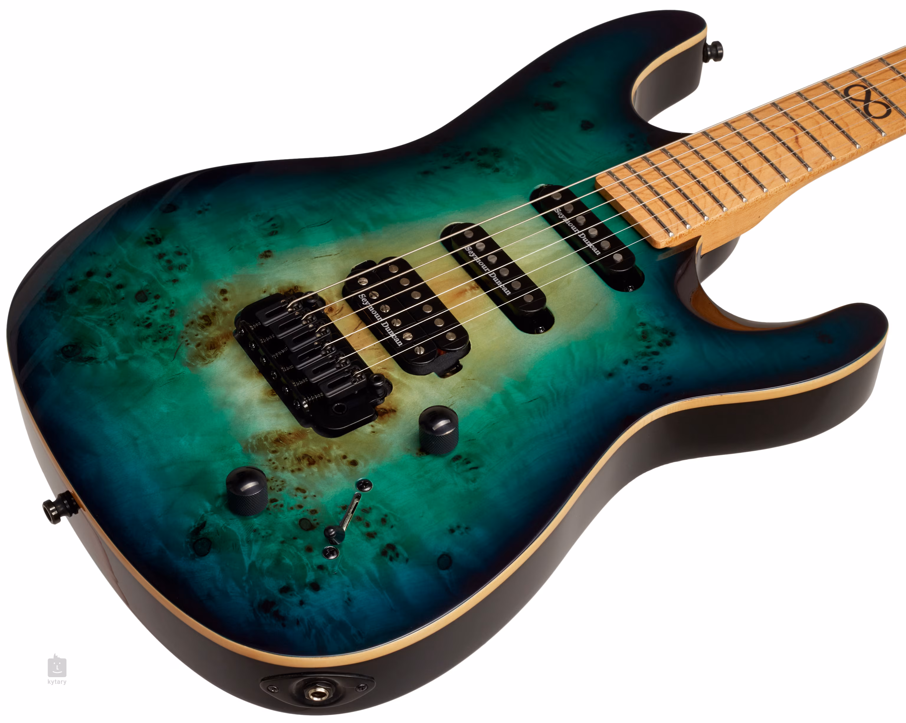 Le corps lime de la ML1 Pro Hybrid Turquoise Rain est orné d'une table plate massive en racine de peuplier. Le beau grain du bois est accentué par une finition de couleur spectaculaire et une laque brillante. Le manche et la touche sont en érable traité thermiquement, ou "cuit". Vingt-deux frettes Jumbo en acier inoxydable divisent la surface de la touche. L'orientation sur sa surface est facilitée par une incrustation de nacre distinctive sur la douzieme frette et des points latéraux luminescents "glow-in-the-dark", qui vous donnent une visibilité parfaite meme dans des environnements rétroéclairés ou completement sombres. Le confort de jeu est garanti par les bords arrondis de la touche, les découpes profilées du haut et du bas du corps au niveau du manche et la coupe pratique du ventre/du ventre.