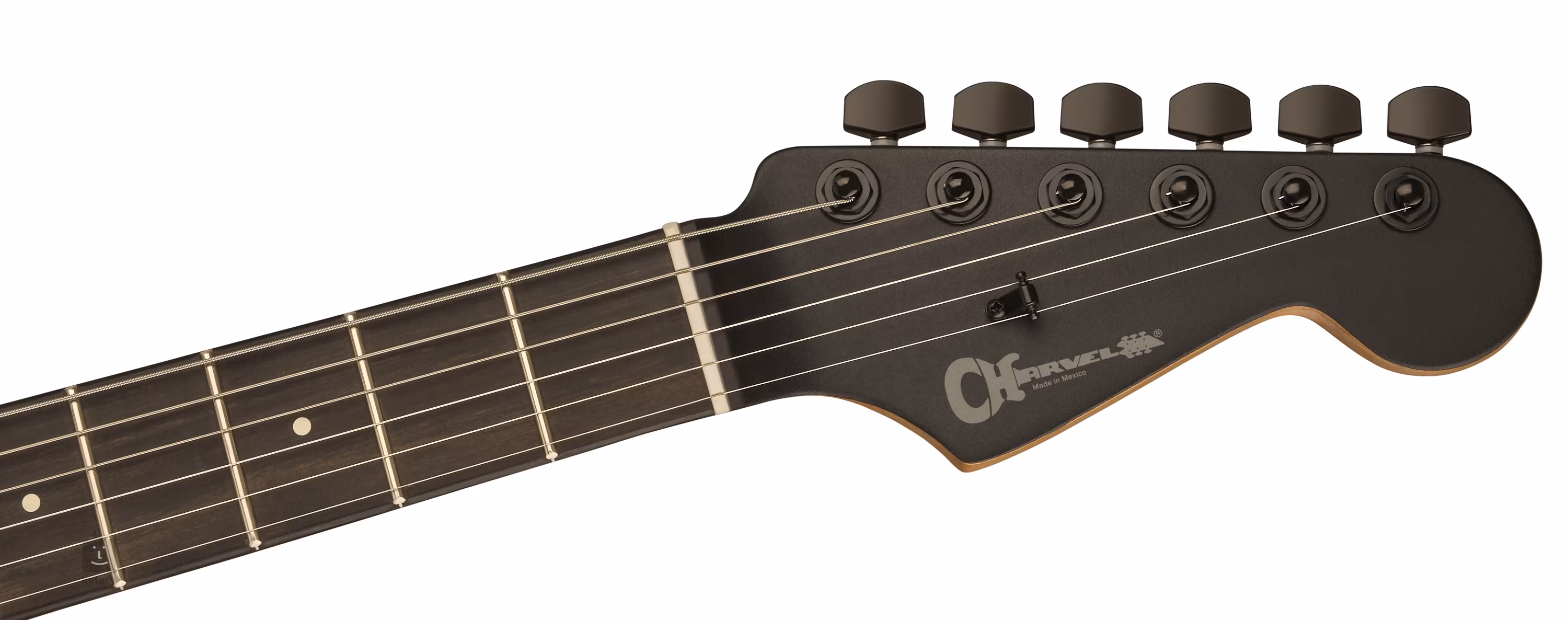 La stabilité de l'accordage est assurée par le montage des cordes à travers la frette zéro Graph Tech TUSQ XL dans les mécaniques verrouillables moulées sous pression de la société et à travers la touche solide via le corps de la guitare. La finition élégante est accentuée par l'accastillage noir et un pickguard de la forme spécifique Charvel "So-Cal".