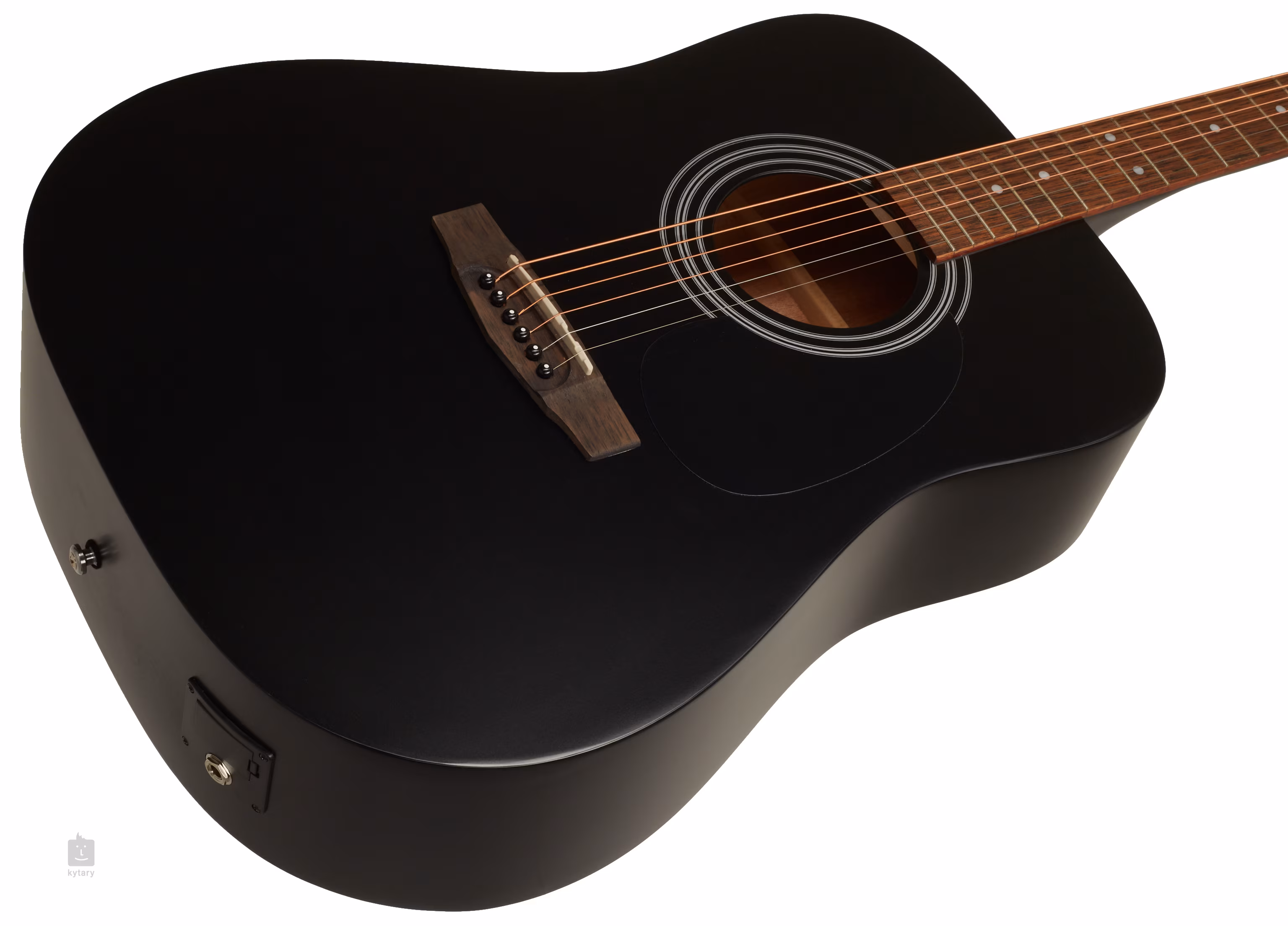 La Cort AD 810E BKS est une guitare électroacoustique de type dreadnought. Le corps de l'instrument est composé d'une façade en épicéa et d'un fond et de côtés en acajou. Cette combinaison éprouvée de bois donne a l'instrument un son équilibré avec la quantité nécessaire de clarté sonore et de chaleur. Collée sur le manche en acajou se trouve une touche en bois exotique merbau équipée de vingt frettes, l'orientation sur sa surface est facilitée par des points de position.