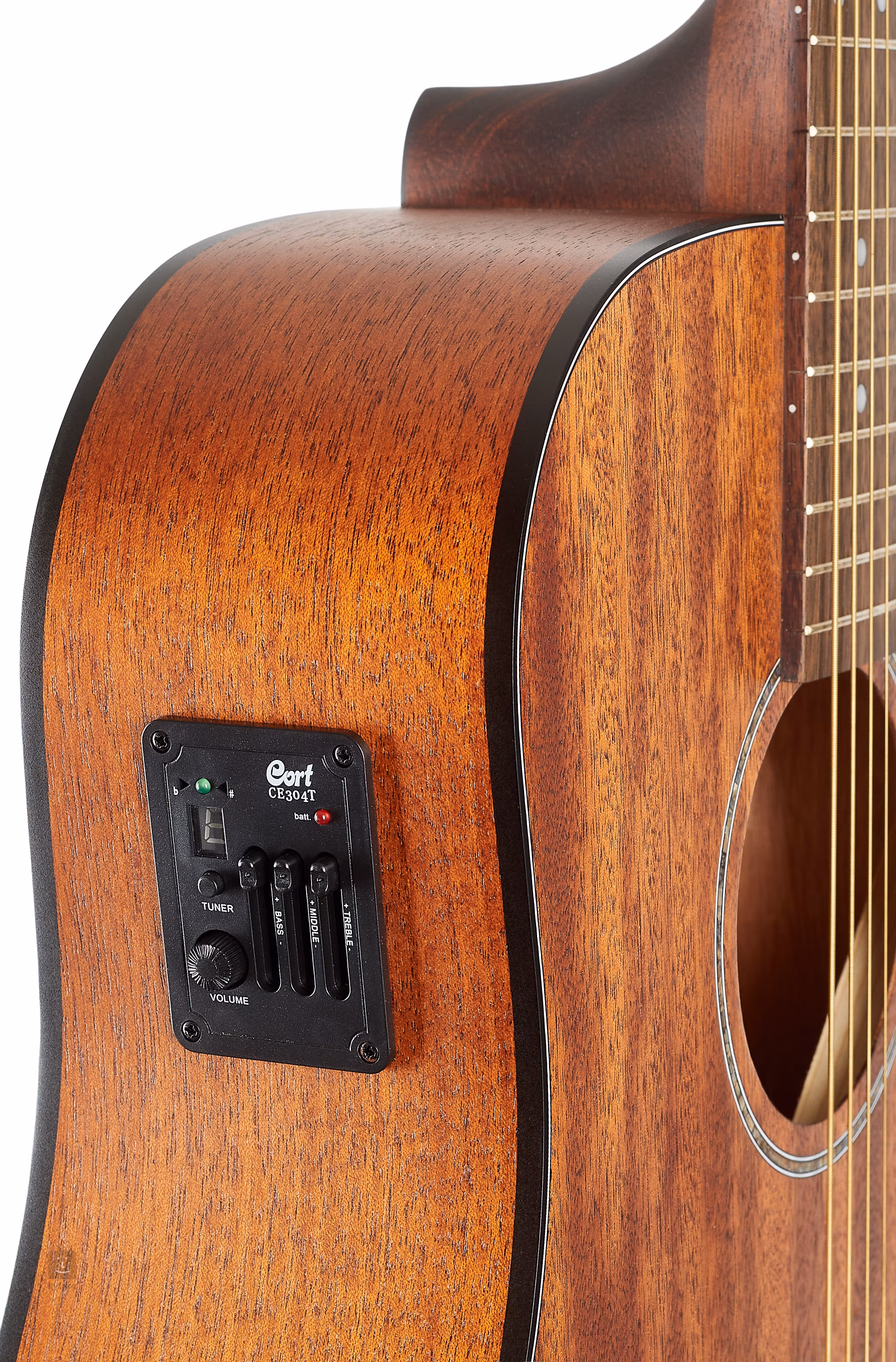 La prise de son est assurée par un préamplificateur Cort CE304T doté d'un égaliseur à trois bandes et d'un accordeur intégré. Les cordes sont montées sur des mécaniques moulées sous pression et sur une touche en bois de figuier. La finition élégante est accentuée par des éléments traditionnels sous la forme d'une rosace perlée (abalone) et d'une bordure de corps noire.
