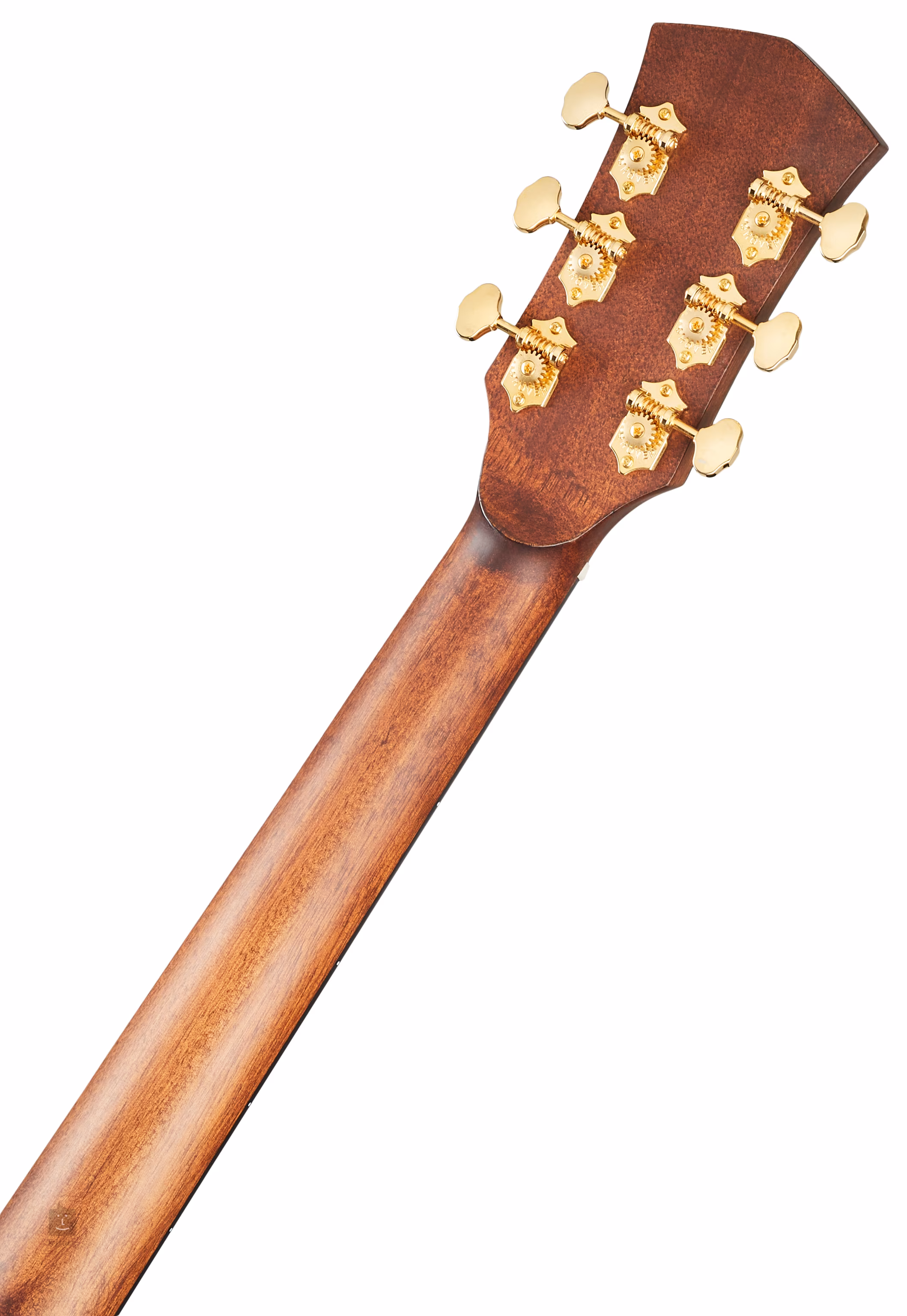 Le manche en acajou est collé a une touche en ébene Makasar a vingt frettes, et l'orientation sur sa surface est facilitée par des points de positionnement et une incrustation décorative sur la douzieme frette. La stabilité du manche et la construction globale de l'instrument sont renforcées par le barrage du manche en noyer et la connexion DoubleLock au corps, qui, avec une fine couche de vernis UV et des nervures X festonnées triées sur le volet, favorisent la résonance acoustique naturelle du bois.