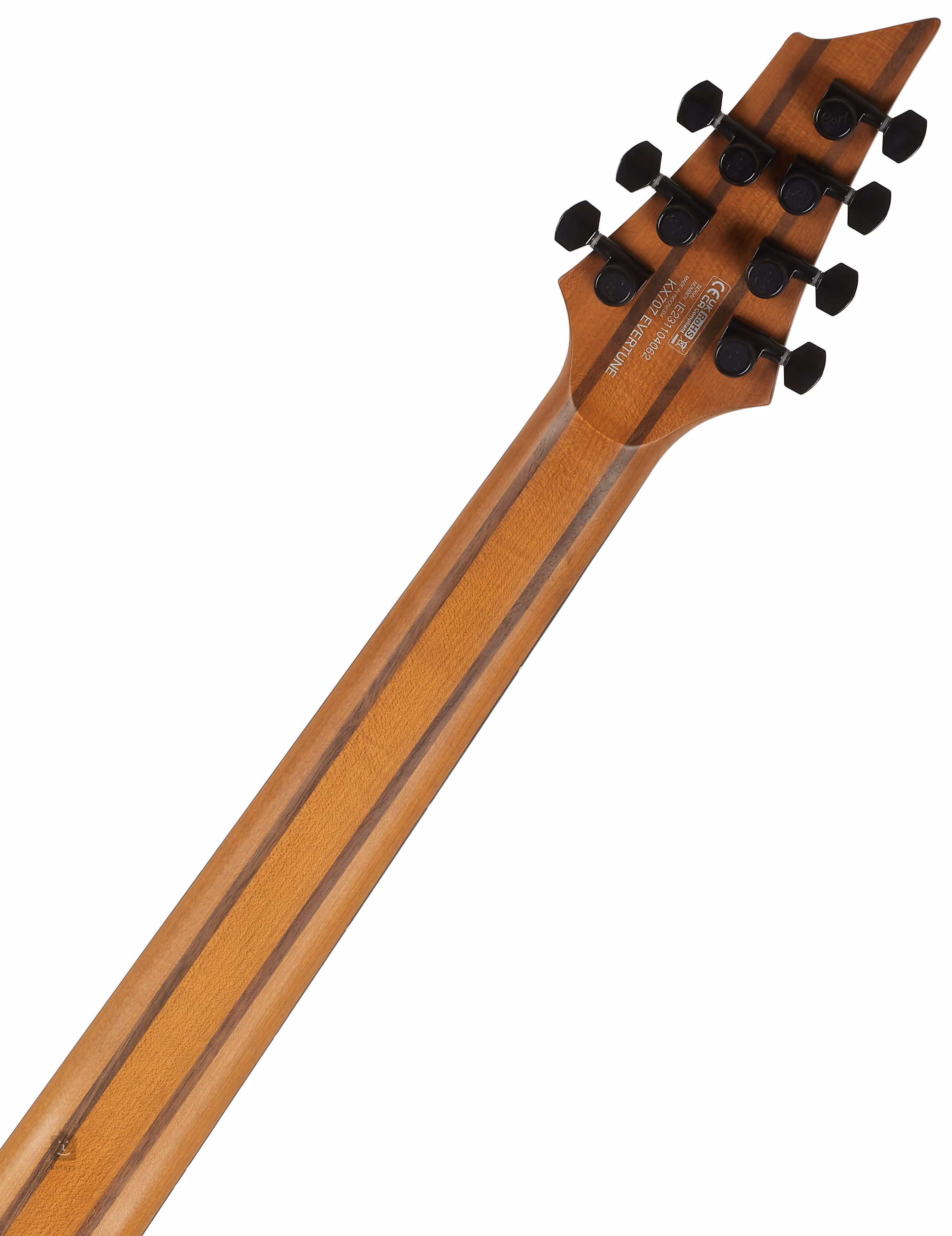 Le corps en acajou de la KX707 EVERTUNE OPBK w/bag à sept cordes est doté d'une table en frêne et d'une finition à pores ouverts. Le manche en cinq parties en érable et noyer est surmonté d'une touche en ébène dotée de 24 frettes en acier inoxydable. Les points latéraux luminescents (luminlay) facilitent l'orientation sur la touche, même au crépuscule.