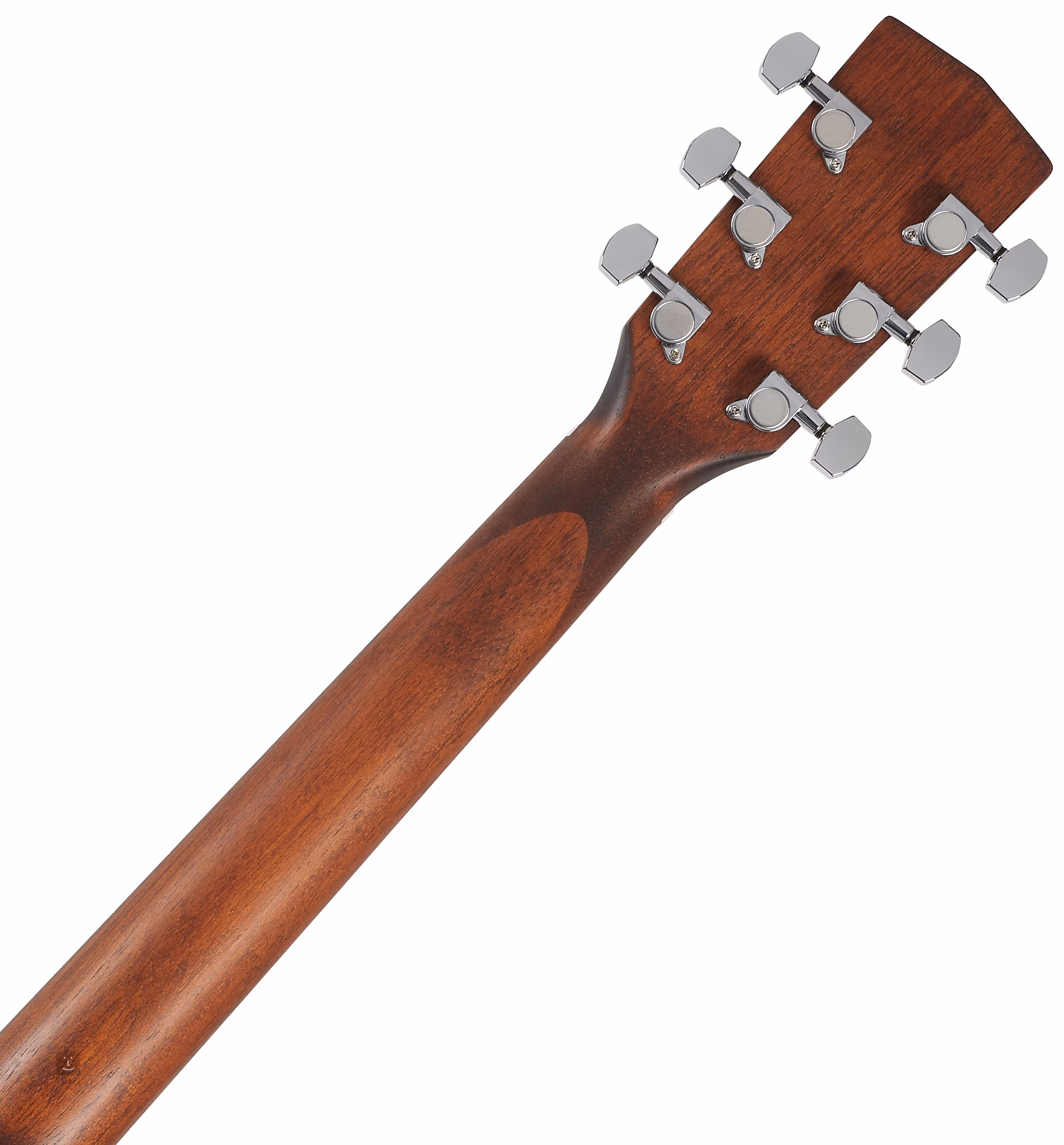 Une touche en figue à 20 frettes est collée au manche en acajou, fixé au corps par un solide joint à queue d'aronde en chevrons. La touche est orientée par des points de positionnement. Les cordes sont montées dans les mécaniques moulées sous pression de l'entreprise et sur la touche en bois de figuier. La finition élégante est accentuée par des éléments traditionnels tels qu'une rosace en nacre (abalone) et une bordure de corps noire.