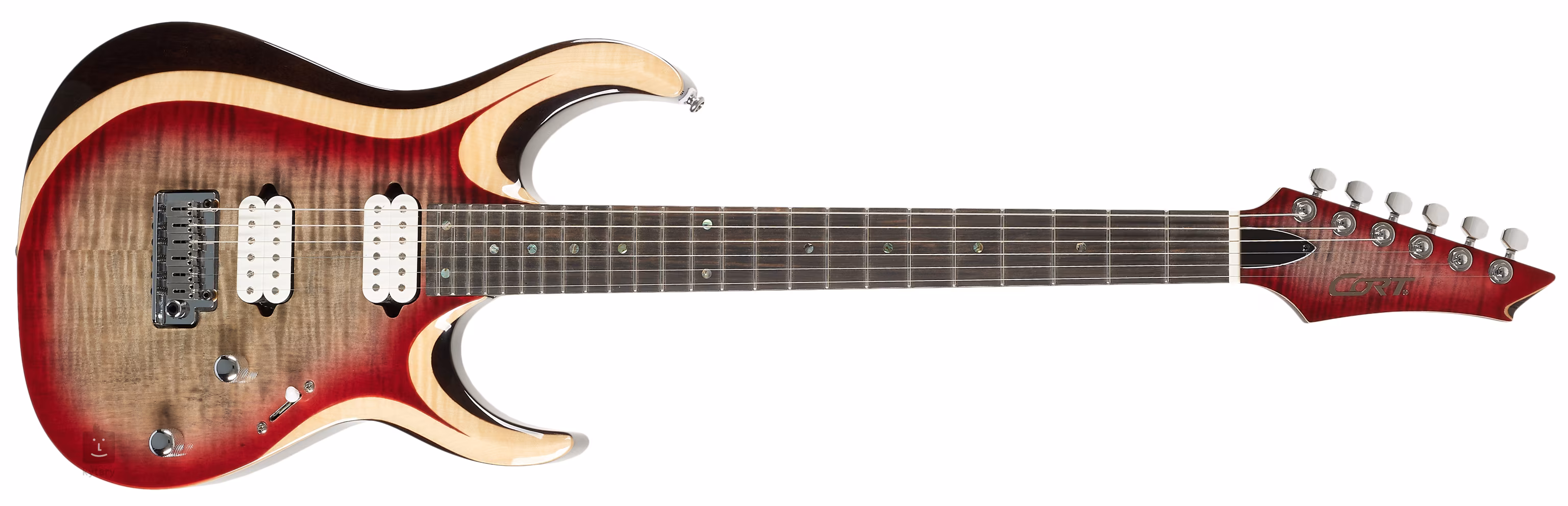 La X700 Duality II LVB est la prochaine étape de Cort vers des modèles plus haut de gamme avec des spécifications professionnelles complètes et doit être prise au sérieux. La guitare attire déjà l'attention au premier coup d'œil grâce à son design moderne et soigné, avec une table d'harmonie en érable flammé sur un corps en acajou et une finition Lava Burst impressionnante. Une touche en ébène munie de 24 frettes en acier inoxydable est collée sur un manche trois pièces en érable et pango. L'orientation sur la touche est facilitée par des points de positionnement perlés (abalone) et des points luminescents sur le côté.