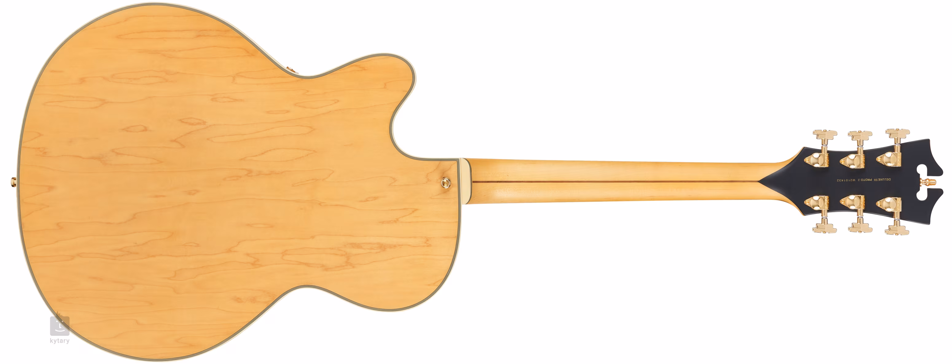 Le corps de la guitare est équilibré par la tête Art déco de la société, ornée d'une incrustation de nacre et du logo de la société. Un accordage stable et un bon sustain sont garantis par la fixation des cordes à travers la frette zéro en os dans les mécanismes de verrouillage Grover 509 Super Rotomatic et à travers le cordage TOM dans le style Art déco. La finition satinée semi-transparente, le corps, la touche et la tête de la guitare en plusieurs couches, le pickguard Scalini à cinq plis, l'accastillage doré et les touches vintage sous forme de capuchons de potentiomètre cupcake ou de commutateurs de micro en forme de tête de poulet accentuent la finition luxueuse de la guitare.