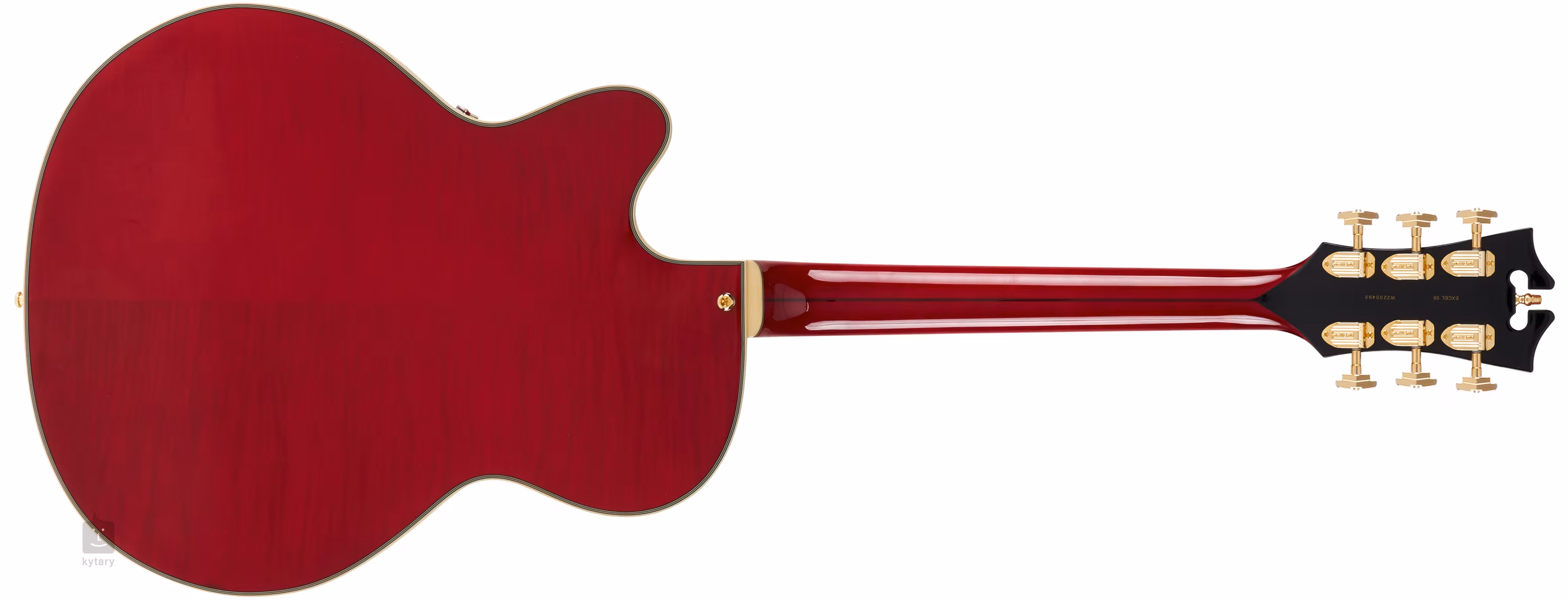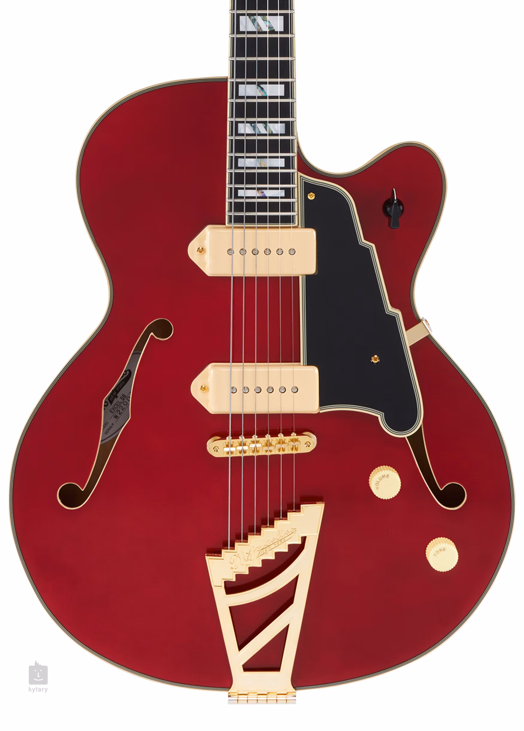 Le corps de la guitare est équilibré par la tête Art déco de la société, ornée d'une incrustation de nacre et du logo de la société. Un accordage stable et un bon sustain sont garantis par la fixation des cordes à travers la frette zéro Graphtech TusQ dans les engrenages Grover 150 Imperial avec un rapport de 16:1 et à travers la tête TOM dans le style Art Deco. La finition luxueuse de la guitare est accentuée par le corps multicouche, la touche et la tête de manche, le pickguard Scalini à cinq plis, l'accastillage doré et les touches vintage sous forme de capuchons de potentiomètre cupcake ou de commutateurs de micro à tête de poulet.
