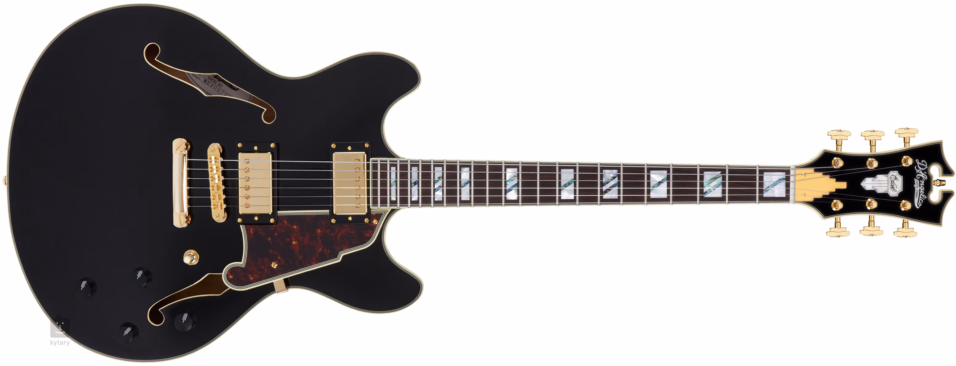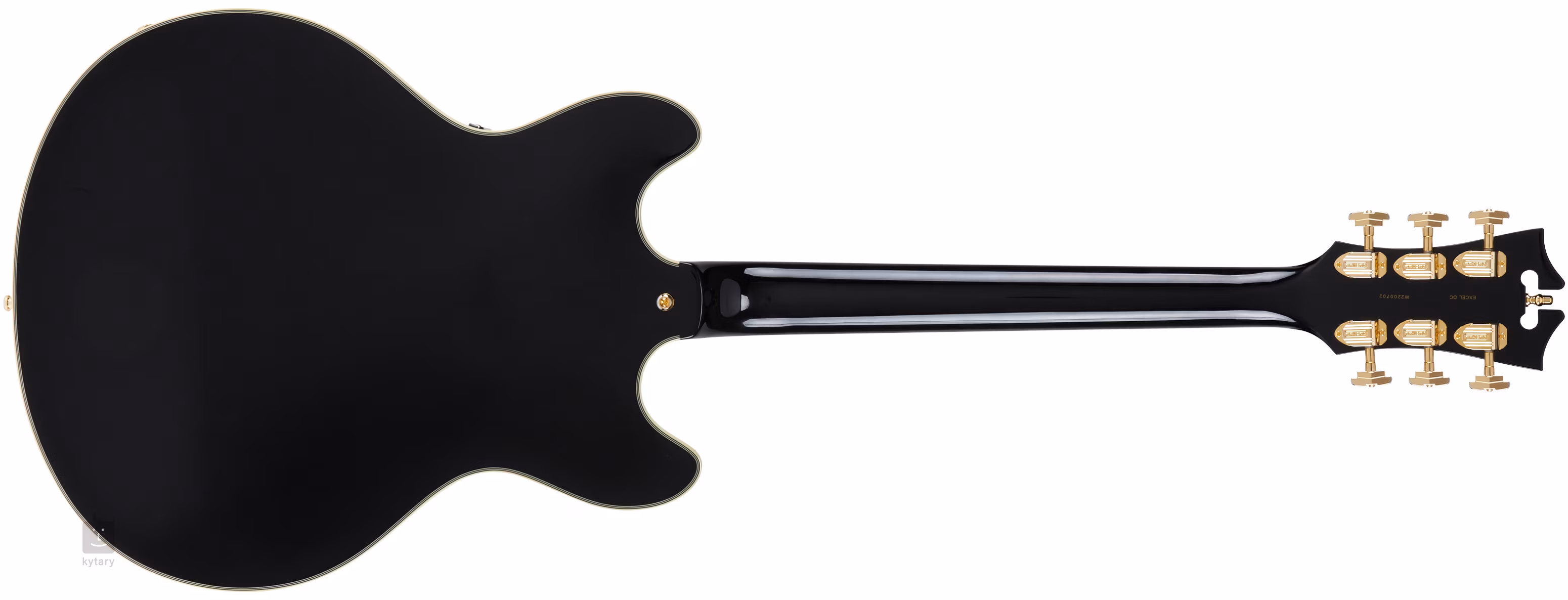 La D'Angelico Excel DC Black est une guitare semi-hollowbody à double coupe. Son corps de 16 pouces de large est fabriqué en érable laminé. Un bloc central rigidifie la table d'harmonie et contrebalance l'effet "binding" indésirable du soufflet.