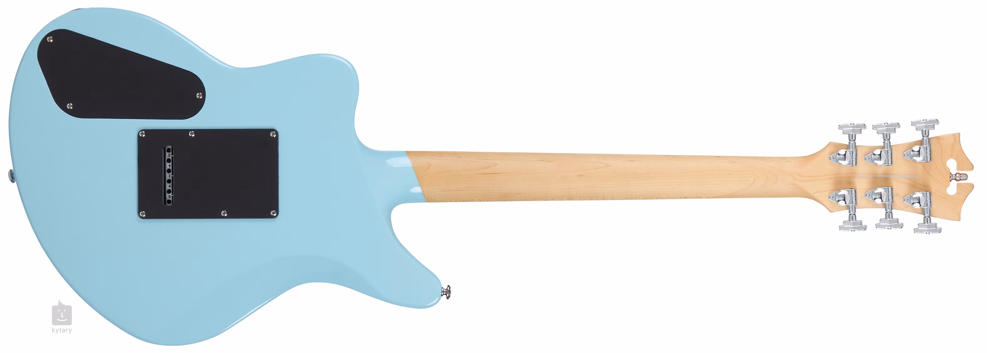 La Premier Bedford Sky Blue est une guitare électrique de la marque américaine D'Angelico dans un design de corps offset élégant. Le corps de l'instrument est en acajou. Un manche en érable avec une construction set-thru, c'est-à-dire un manche encastré plus profondément dans le corps, et un agréable profil en "C" est collé à une touche en ovangkol équipée de vingt-deux frettes de taille moyenne. L'orientation sur sa surface est facilitée par des blocs de position en nacre d'imitation.