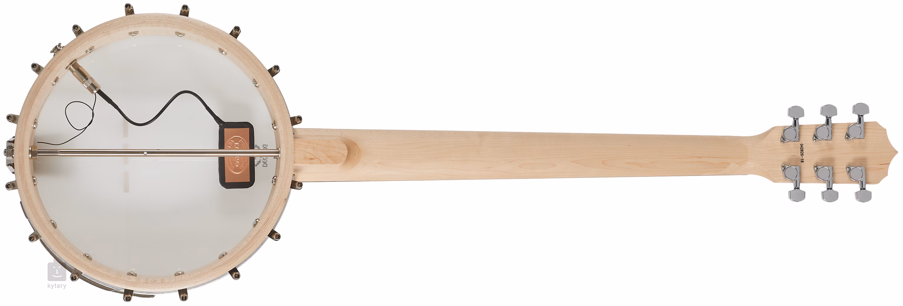 Le Goodtime Six-string banjo avec un accordage guitare et un manche confortable de type guitare acoustique permet aux musiciens de jouer ce qu'ils savent déjà faire, mais avec un son et un manche différents. Il s'agit d'un modèle à dos ouvert, c'est-à-dire un banjo sans résonateur avec une plaque arrière ouverte et un son merveilleusement chaud. Outre un corps de grande qualité composé de trois couches d'érable massif, il offre une touche en bois de pau ferro munie de vingt-deux frettes en pakfong (laiton nickelé), des repères de position en imitation de nacre, un soufflet de onze pouces fixé au corps à l'aide d'un système de tension standard (mousqueton et crochets en acier), et les cordes sont maintenues dans des mécanismes fermés de type guitare de haute qualité, avec une touche en érable/ébène et des barrettes en acier nickelé.