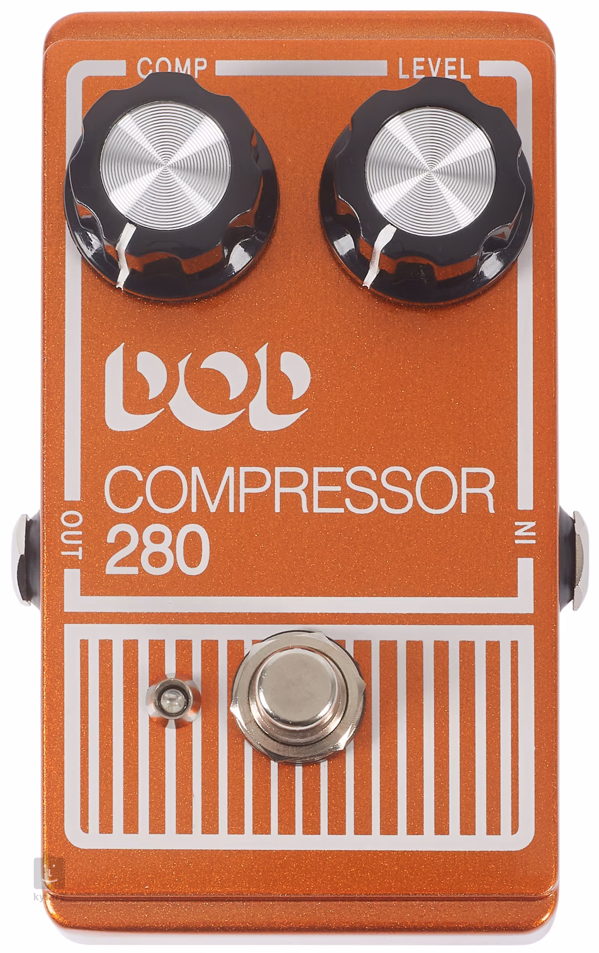Le Digitech DOD280 permet également de niveler le signal d'entrée de votre guitare. Cela permet d'allonger le sustain, de resserrer le son et de se débarrasser de l'écrêtage du signal. Le contrôle est assuré par deux potentiomètres : le premier règle le niveau de compression et le second l'intensité du signal de sortie. L'effet déclenché est indiqué par un voyant allumé.