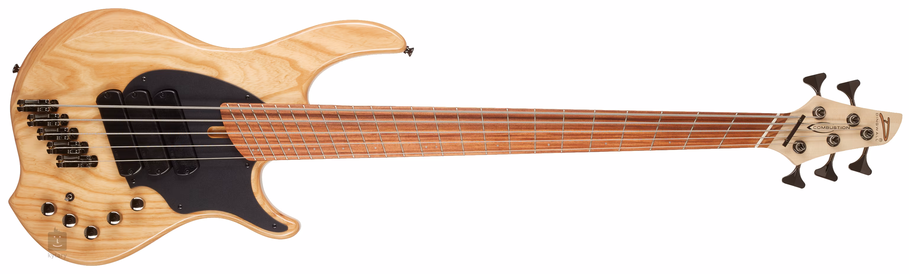 Basse à cinq cordes de la série Combustion de Dingwall, dans une couleur naturelle qui met en valeur le beau grain du bois de frêne.