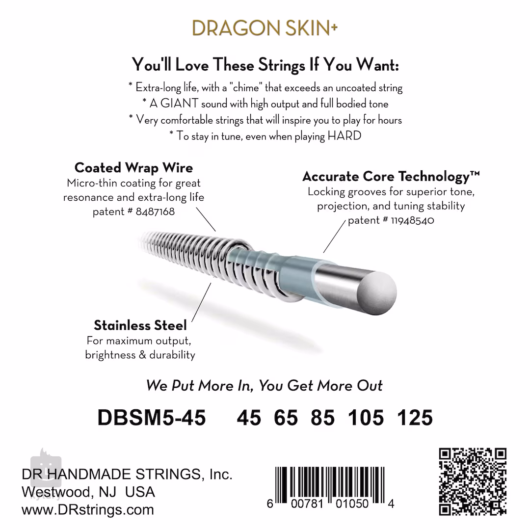 Les cordes DR Dragon Skin+ pour basse ont un son très puissant et équilibré en fréquence. Un revêtement anticorrosion spécial leur confère une durabilité et une longévité accrues. De plus, elles utilisent la technologie brevetée Accurate Core, qui assure une bonne prise sur le fil enroulé et donc un accord stable grâce aux fines rainures sur l'âme de la corde.