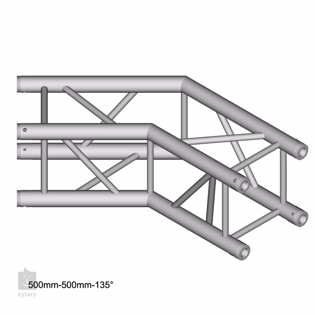 Le DuraTruss DT 34-C23-L135 est la pièce d'angle de la construction en aluminium à quatre points de la série DT34, qui se brise à un angle de 135°. Cette série est appréciée pour sa résistance et sa capacité de charge élevées, ce qui en fait le choix idéal pour construire des scènes mobiles fiables. Les tubes principaux de la structure sont en aluminium durable et ont un diamètre de 50 mm, avec une épaisseur de paroi de 2 mm. Les poutrelles de 16 mm de diamètre assurent ensuite une connexion solide avec la possibilité de charges élevées. Grâce au mécanisme de couplage innovant, le système assure une installation et un retrait rapides, ce qui est idéal pour une utilisation fréquente. Tous les éléments de connexion nécessaires sont inclus.